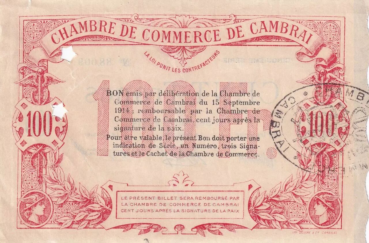 The reverse of the note displays the inscription "CHAMBRE DE COMMERCE DE CAMBRAI", repeated, as well as the clause concerning reimbursement: "The present note will be reimbursed by the Chamber of Commerce of Cambrai one hundred days after the signing of the peace."