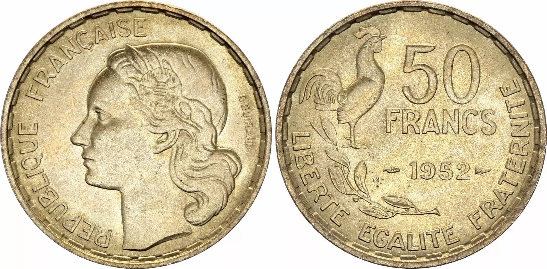 Cette pièce est une pièce de monnaie de la République Française, frappée en 1952. Sa valeur nominale est de 50 francs. La pièce est fabriquée à partir d'un alliage de cuivre et d'aluminium.