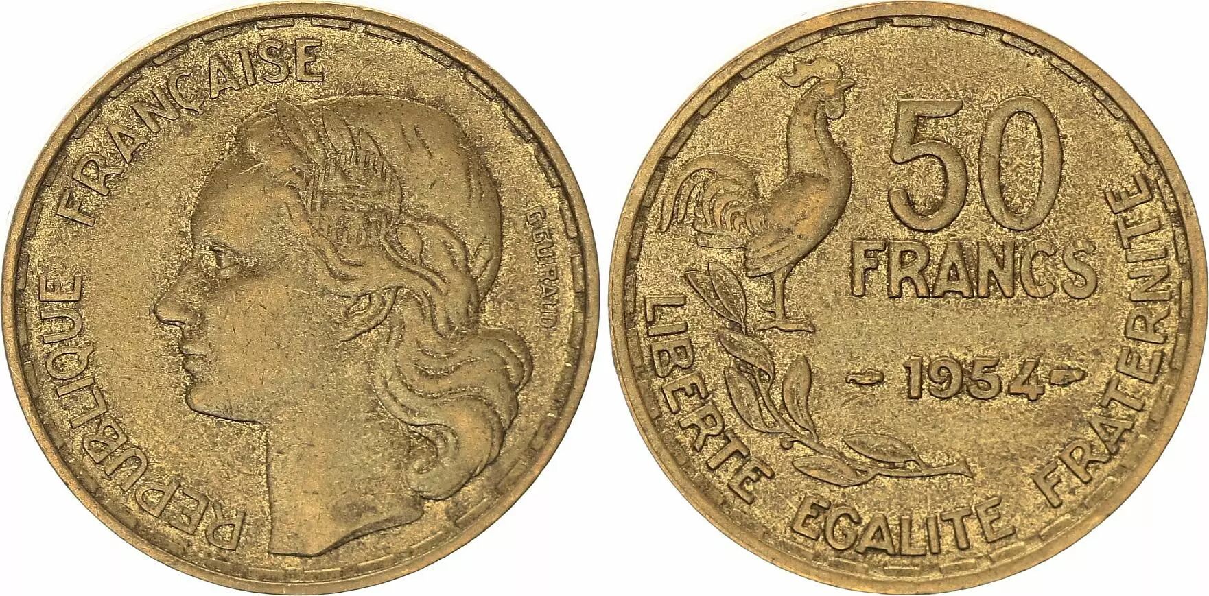 La pièce de 50 Francs Guiraud, frappée en 1954, est une pièce de monnaie française d'une valeur nominale de 50 francs. Elle est composée de bronze et d'aluminium, lui conférant une couleur et des propriétés physiques spécifiques. Son poids est de 8 grammes et son diamètre mesure 27 millimètres.