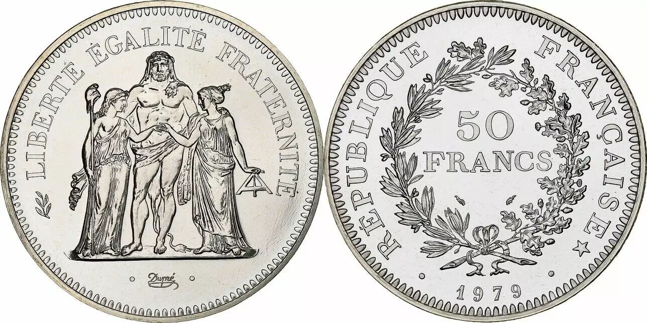 Revers : Le revers de la pièce présente une couronne composée de branches de chêne et de laurier. Au centre de cette couronne figure la valeur nominale "50 FRANCS" et l'année d'émission. Autour de la couronne, on peut lire "LIBERTÉ ÉGALITÉ FRATERNITÉ".