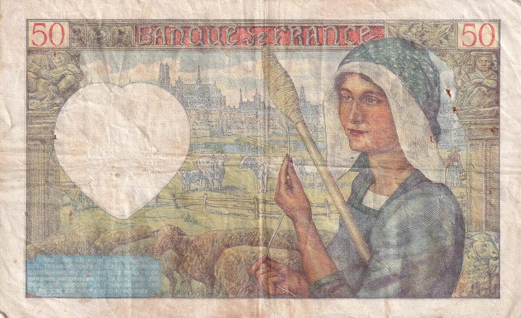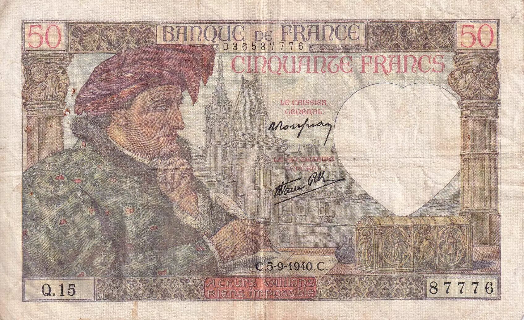 Banknote France 50 Francs Jacques Coeur - 05-09-1940 - Serial Q.15 - F to VF - P.93