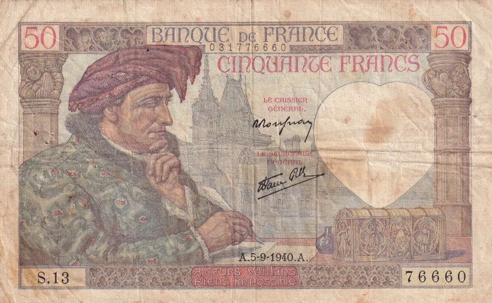 plis, salissures, épinglages, billet usagé, trace de rouille, tâches