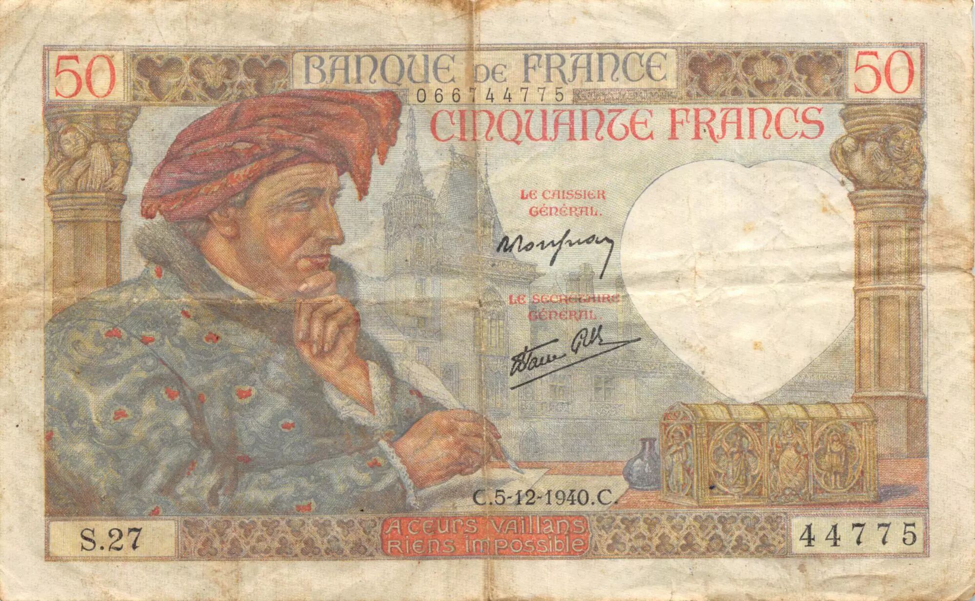 Banknote France 50 Francs Jacques Coeur - 05-12-1940 Serial S.27 - F to VF