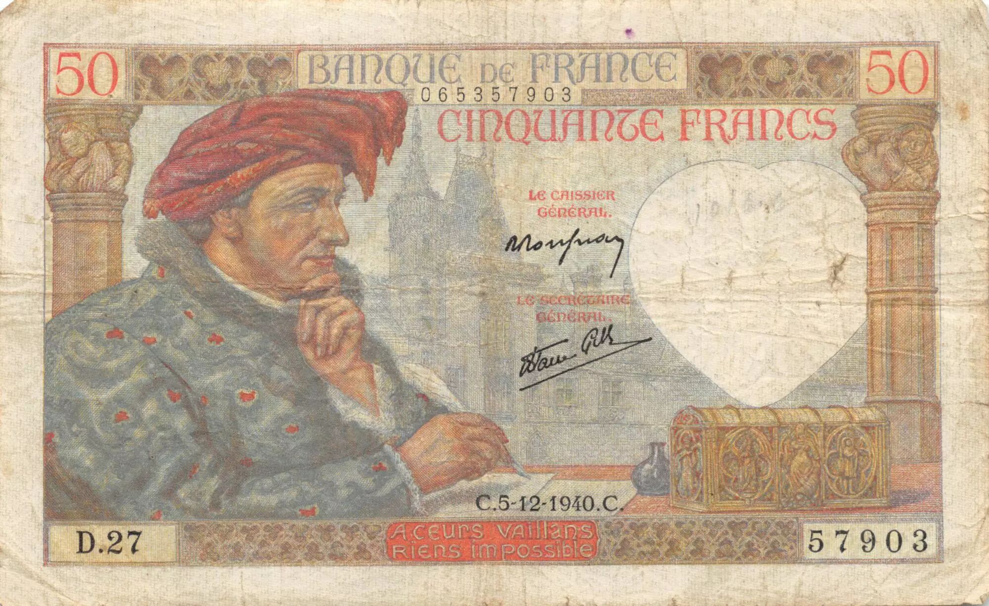 Billet France 50 Francs Jacques Coeur - 05-12-1940 Série D.27 - PTTB
