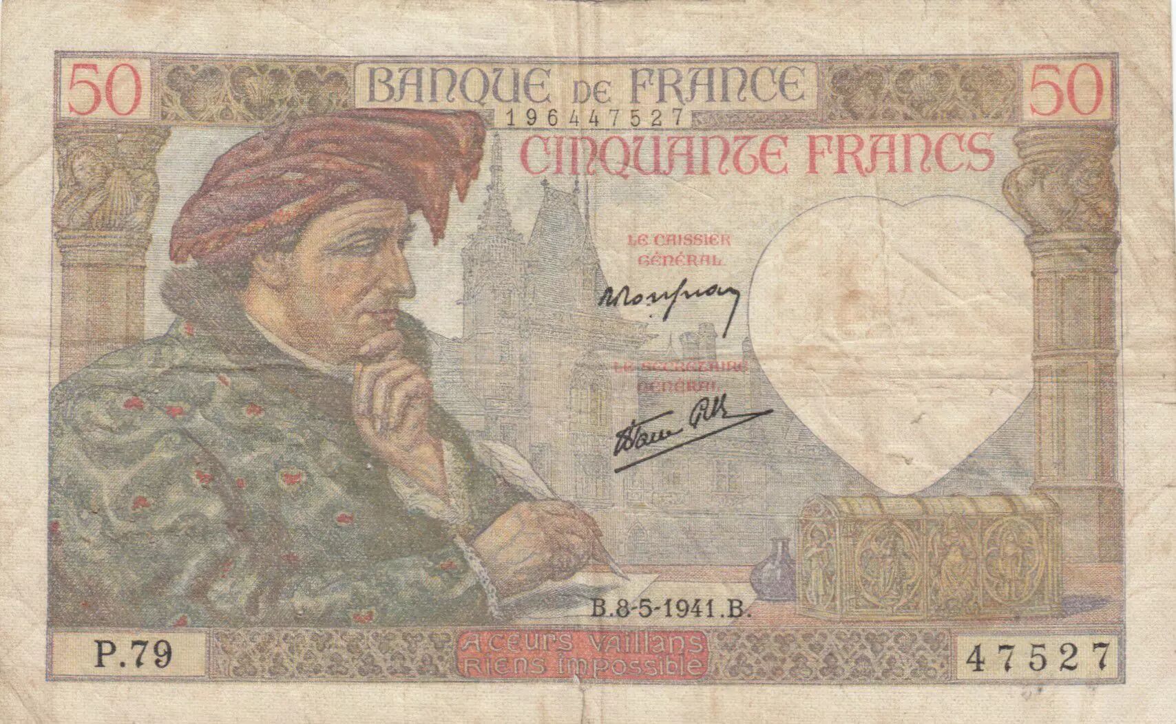 Accueil > Archivage > archivage-Archivage > France 50 Francs Jacques Coeur - 08-05-1941 Série P.79 - TB