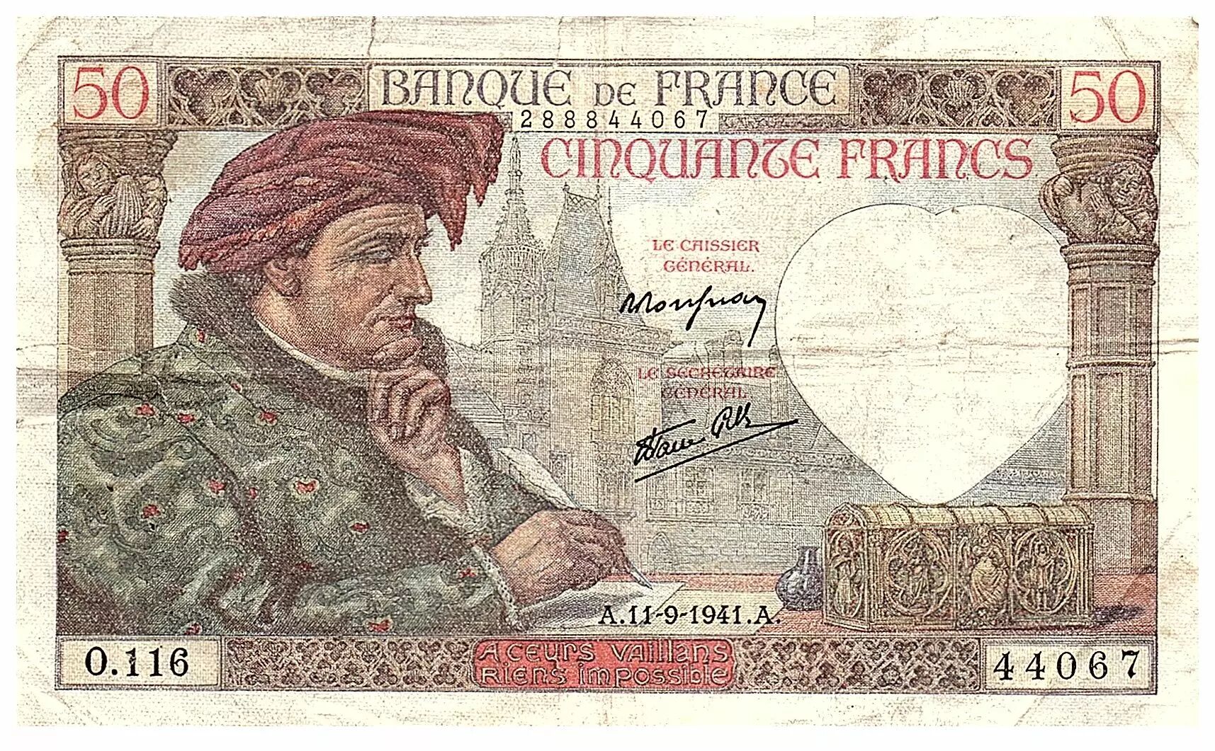 Accueil > Billets Français > Billets Banque de France > Billets 50 Francs > France 50 Francs Jacques Coeur - 11-09-1941 - Série O.116 - Fay.19.14
