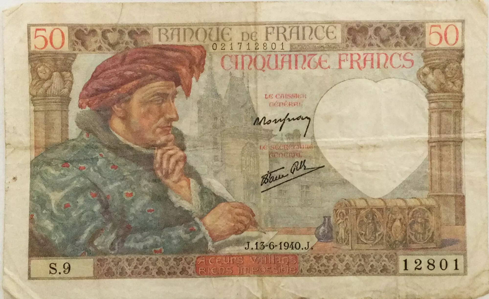 Home > > France 50 Francs Jacques Coeur - 13-06-1940 Serial S.9 - VF