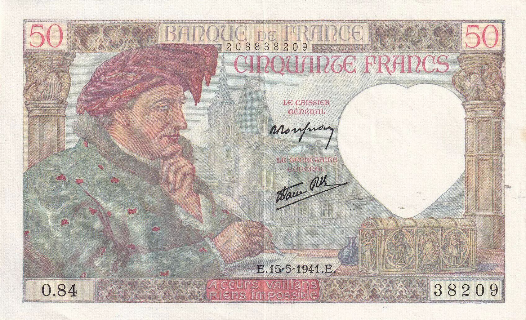 Banknote France 50 Francs Jacques Coeur - 15-05-1941 - Serial O.84 - P.93