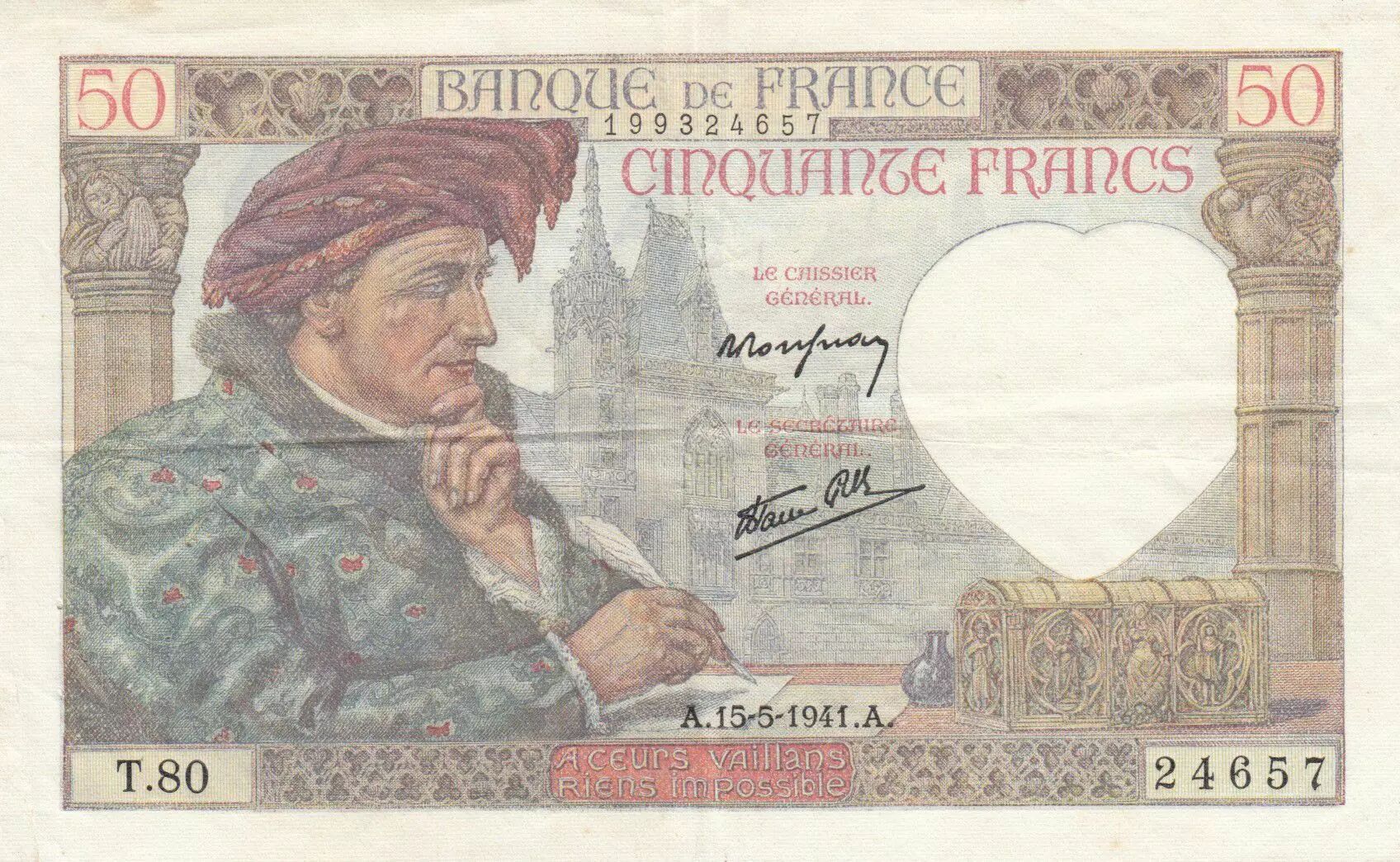 Home > > France 50 Francs Jacques Coeur - 15-05-1941 Serial T.80 - VF