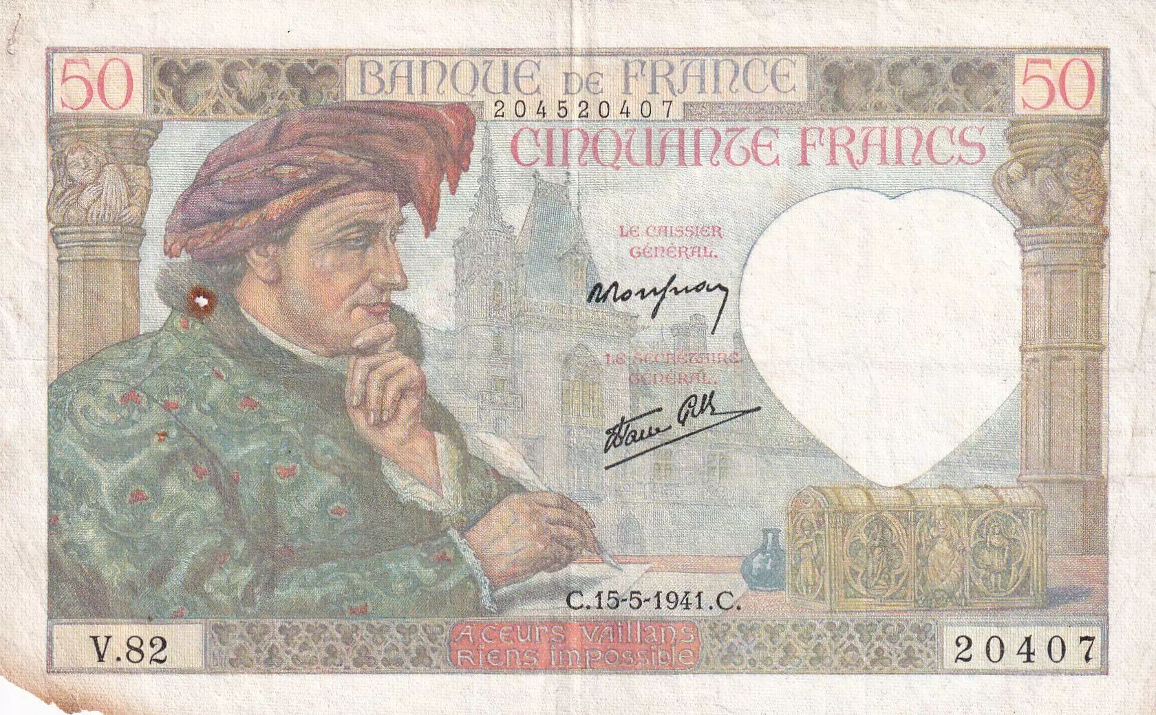 Accueil > Archivage > France 50 Francs Jacques Coeur - 15-05-1941 - Série V.82 - F.19.11