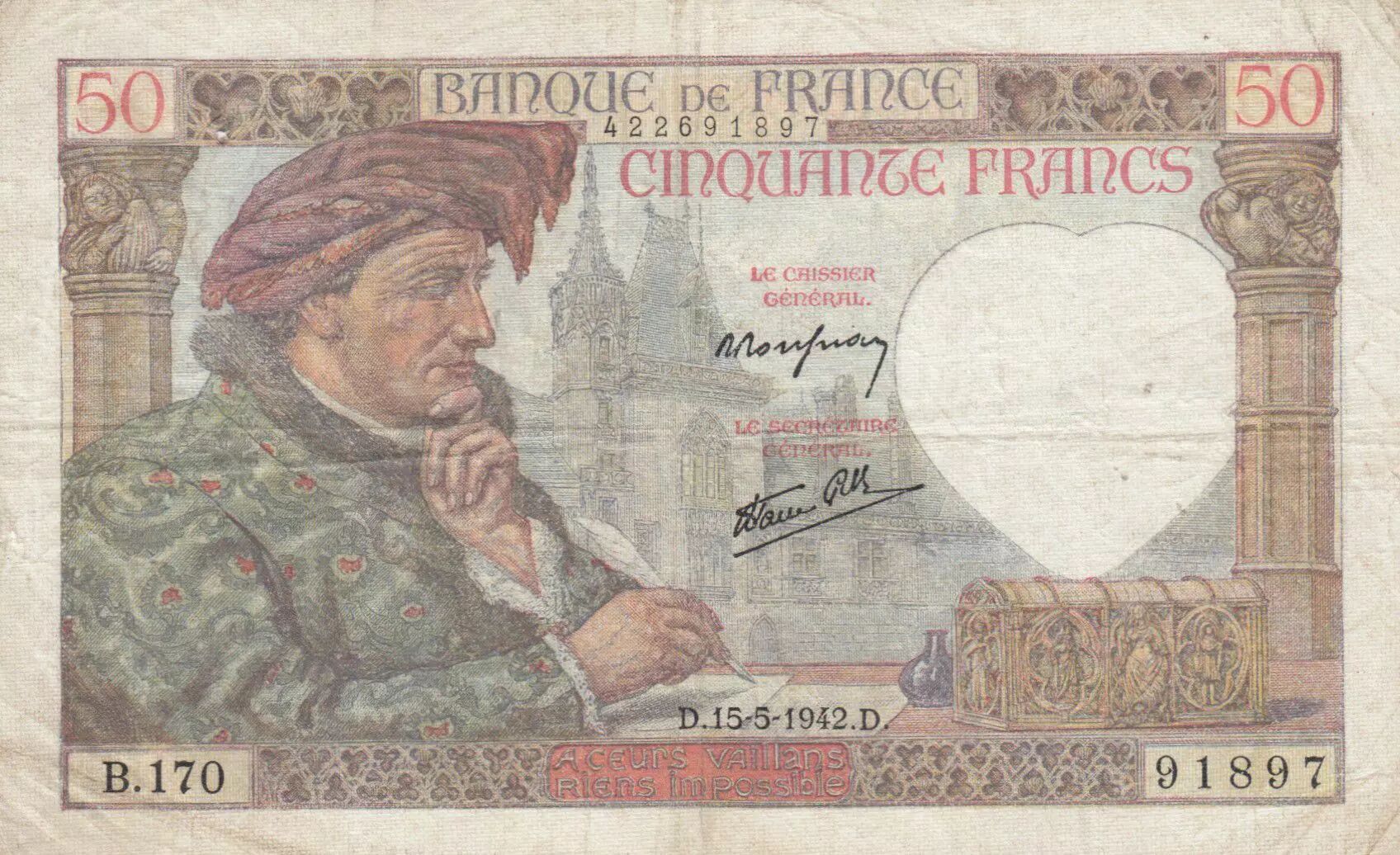 Accueil > Archivage > archivage-Archivage > France 50 Francs Jacques Coeur - 15-05-1942 Série B.170 - TB+