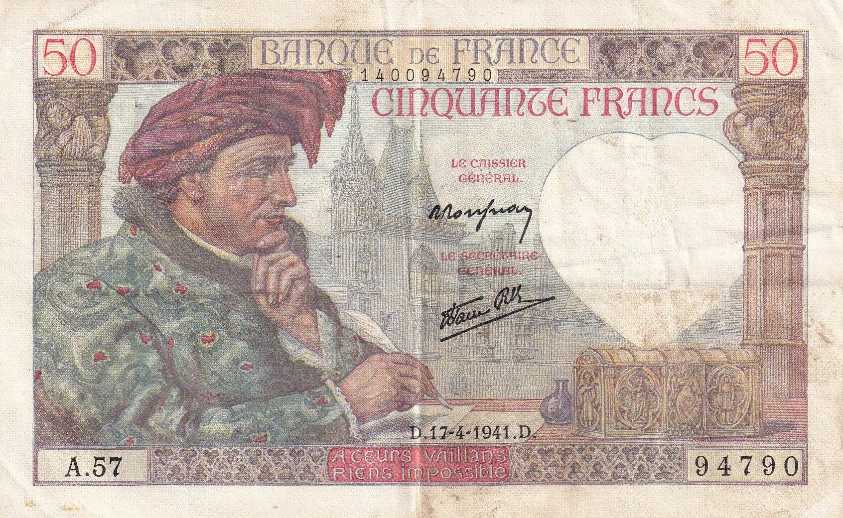 Accueil > Archivage > France 50 Francs Jacques Coeur - 17-04-1941 - Série A.57 - F.19.08