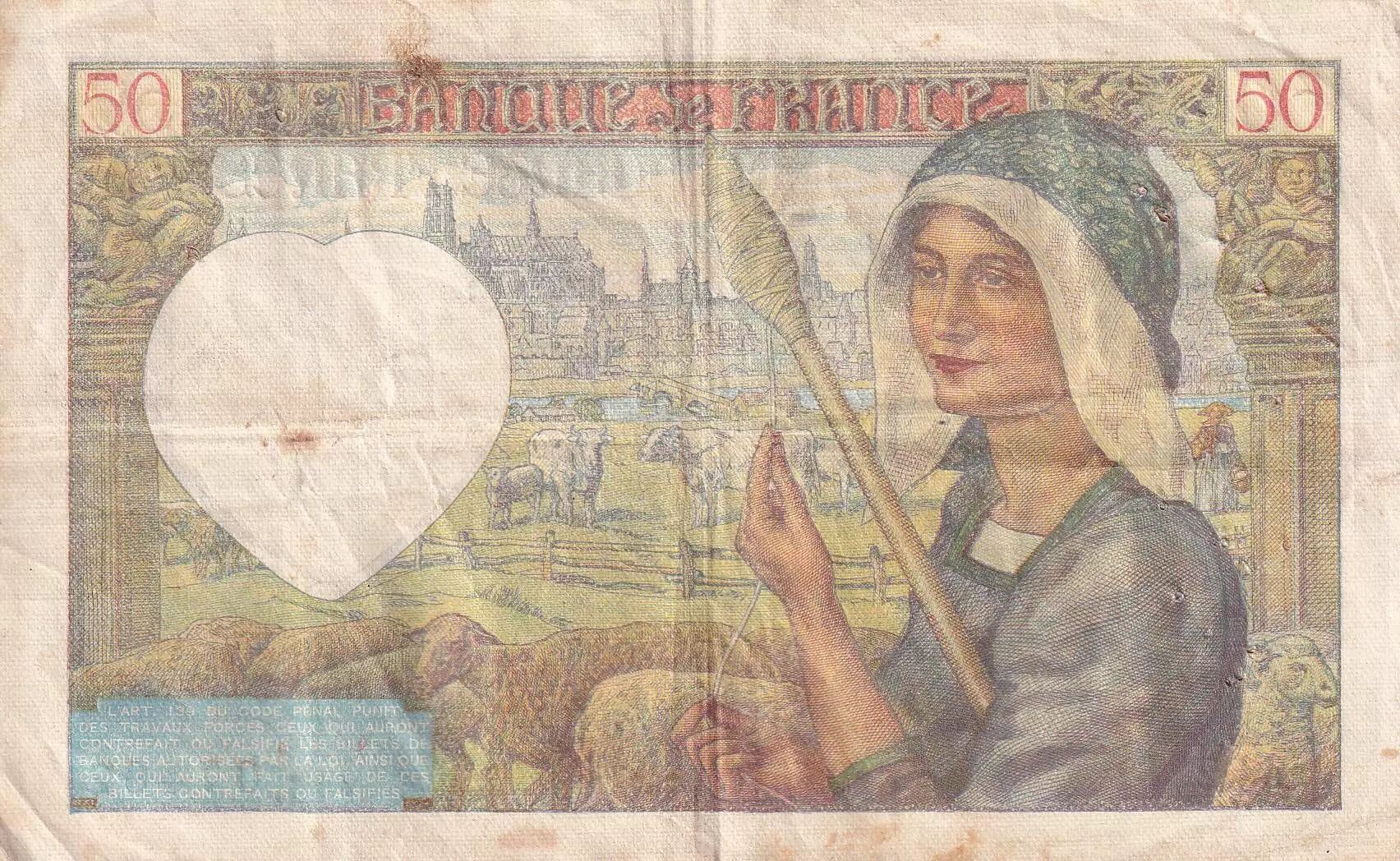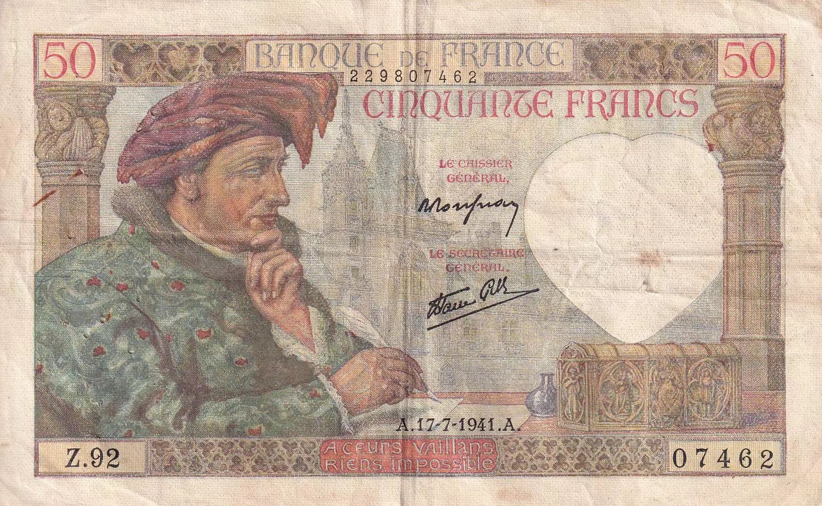 Accueil > Archivage > France 50 Francs Jacques Coeur - 17-07-1941 - Série Z.92 - TB+ - F.19.12