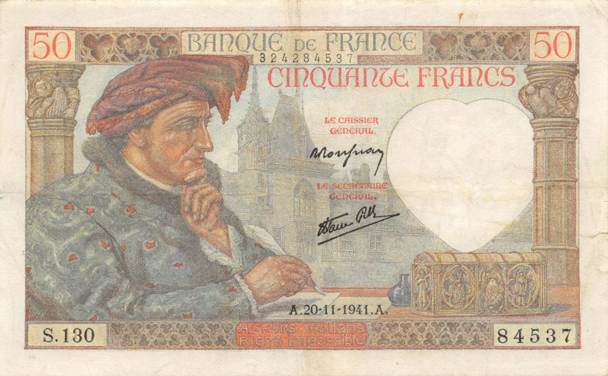 Home > > France 50 Francs Jacques Coeur - 20-11-1941 Serial S.130 - VF