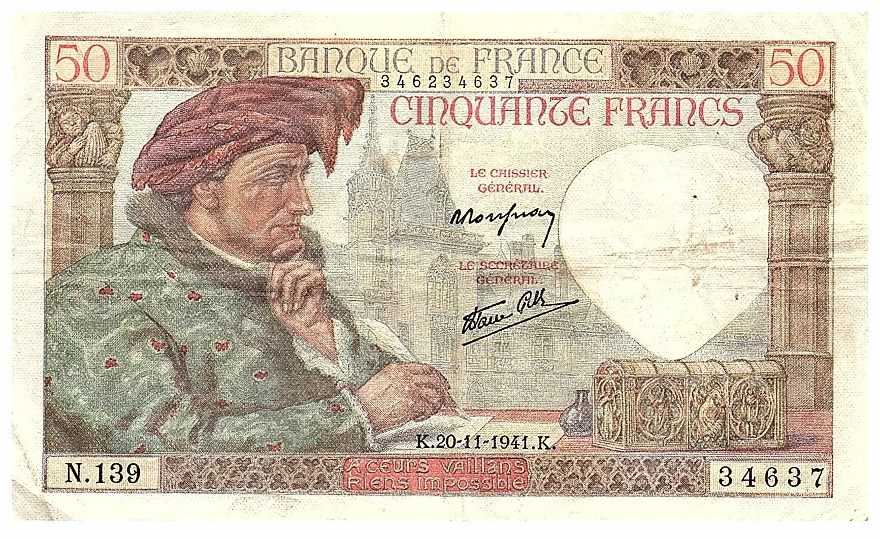 Accueil > Archivage > France 50 Francs Jacques Coeur - 20-11-1941 - Série N.139-34637 - F.19.16