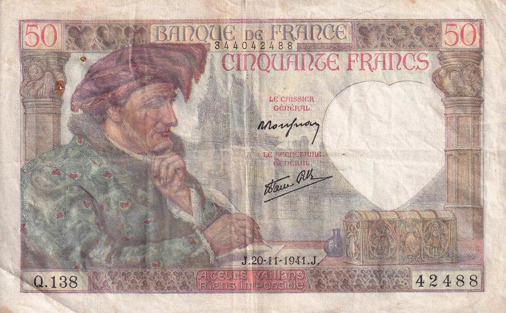 Accueil > Archivage > France 50 Francs Jacques Coeur - 20-11-1941 - Série Q.138 - TB+ - F.19.16