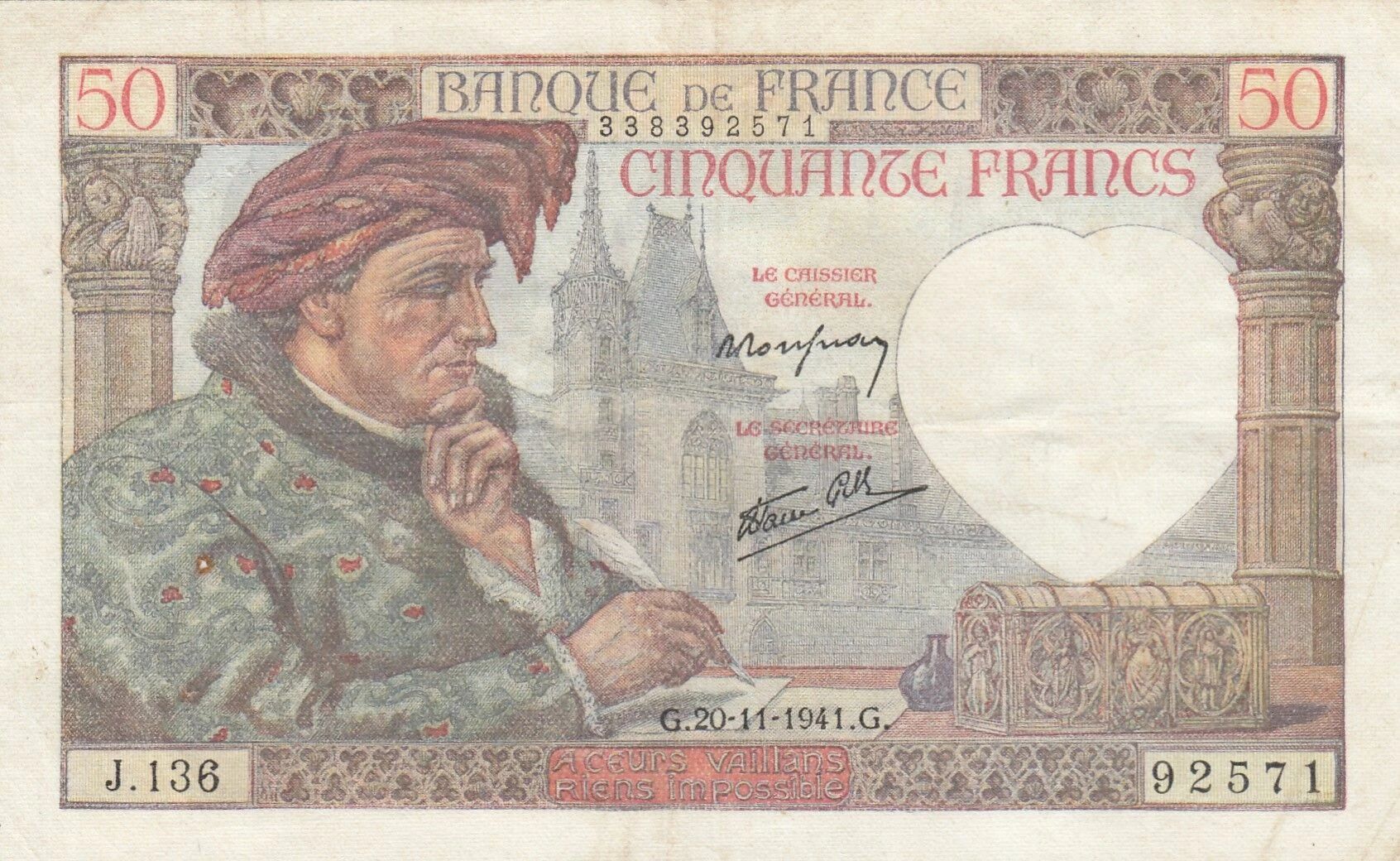 This French banknote with a face value of 50 francs was issued on November 20, 1941. It belongs to the J.136 series.