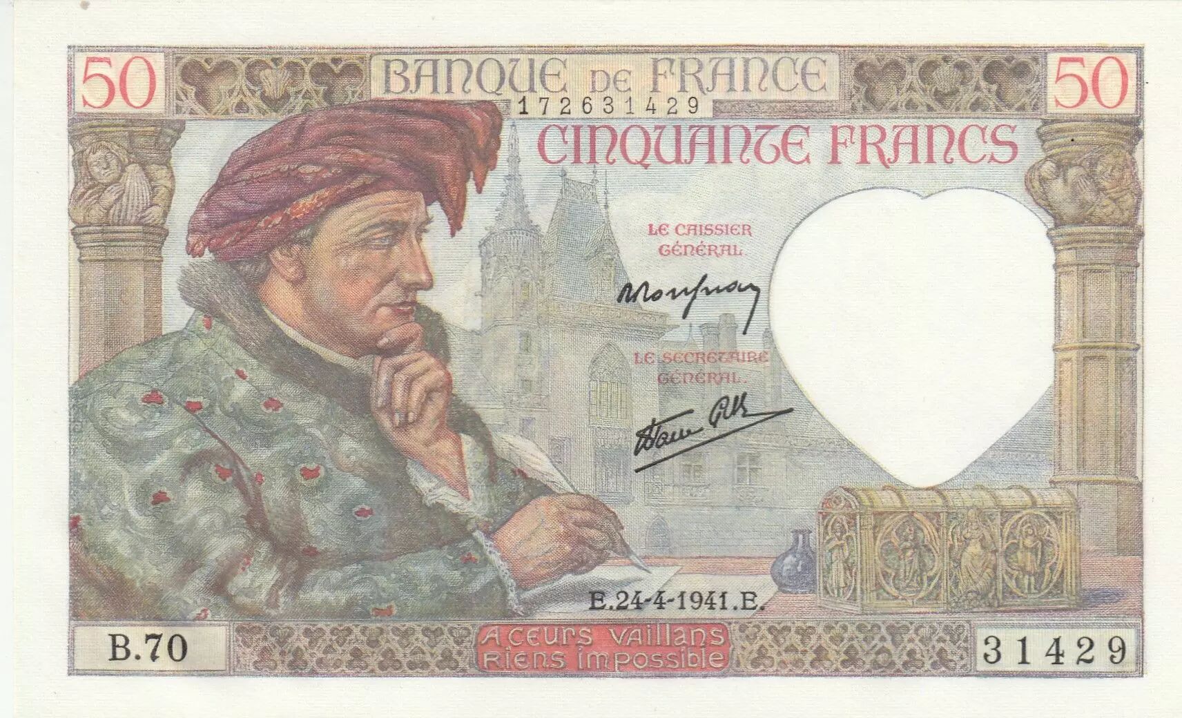 Billet France 50 Francs - Jacques Coeur - 24-04-1941- Série B.70