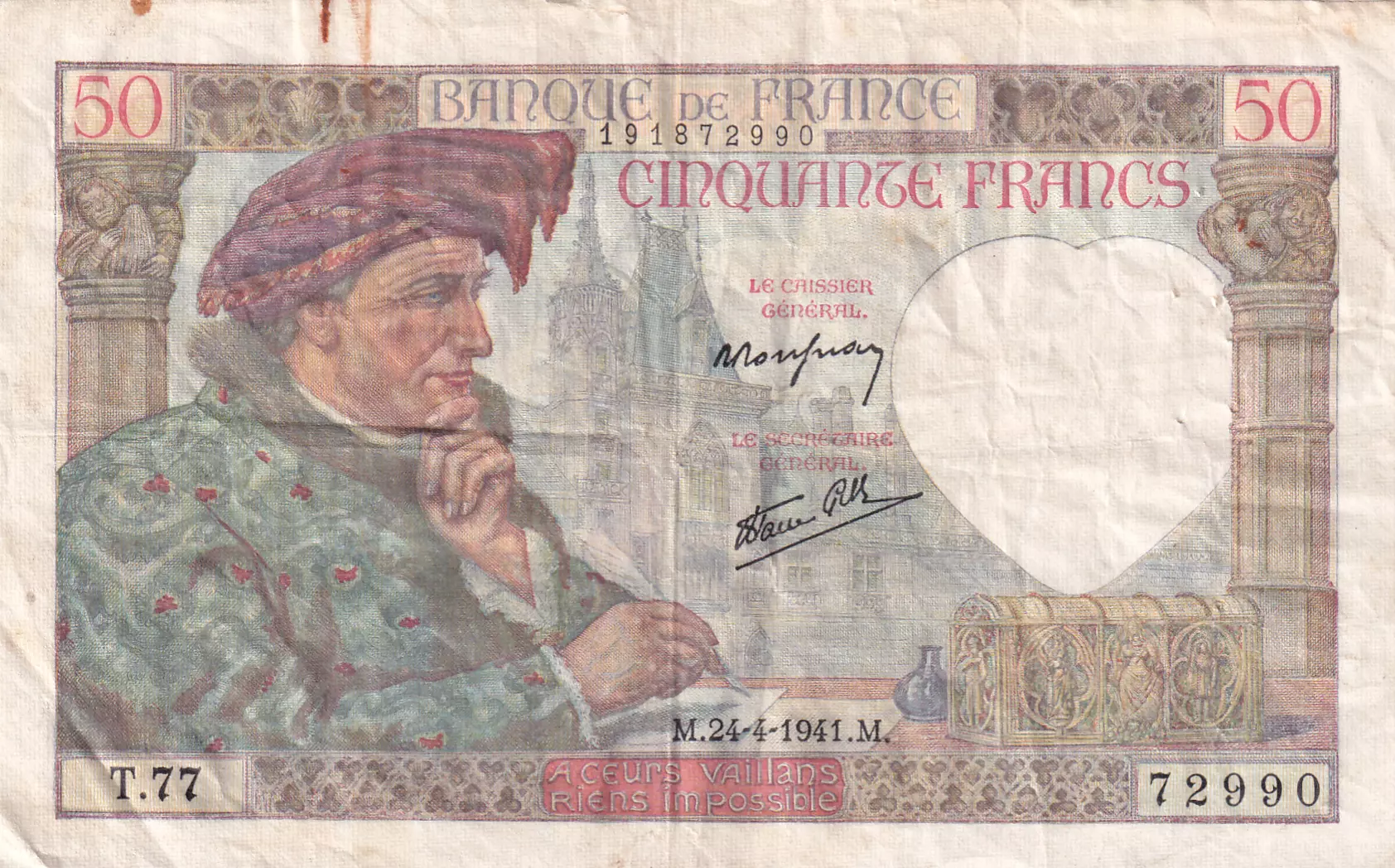 Billet France 50 Francs Jacques Coeur - 24-04-1941 Série T.77 - TTB