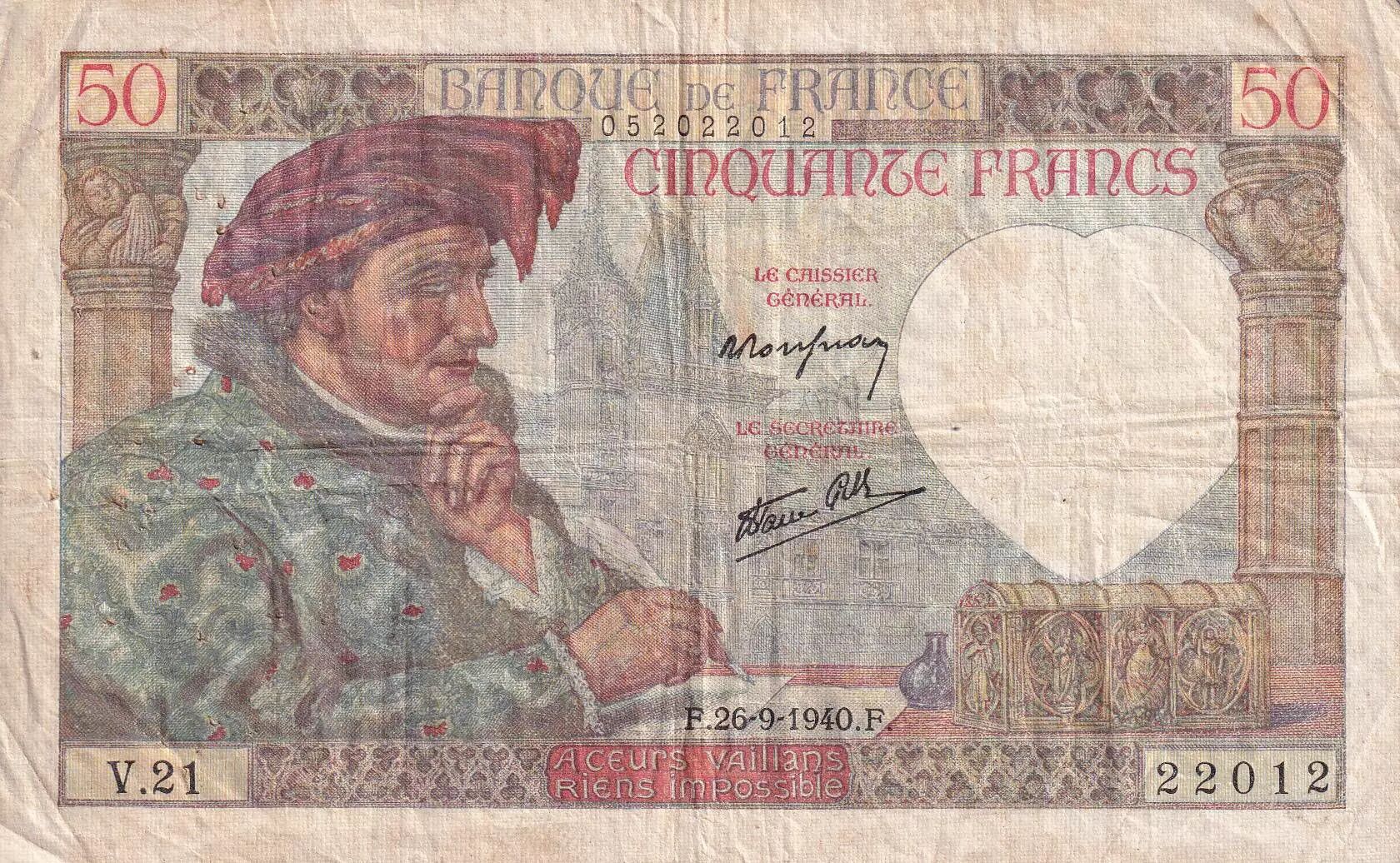 Banknote France 50 Francs Jacques Coeur - 26-09-1940 - Serial V.21 - F - P.93