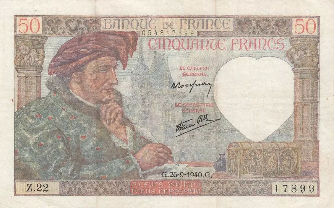 Home > > France 50 Francs Jacques Coeur - 26-09-1940 - Serial Z.22 - VF