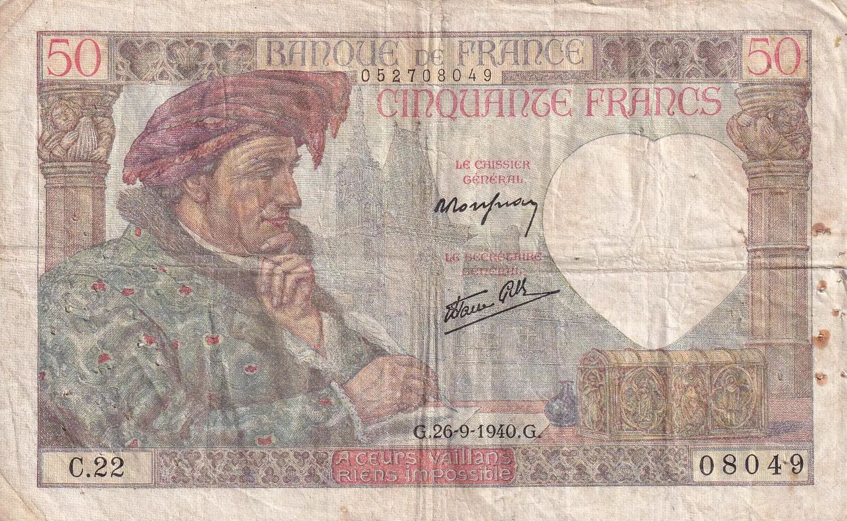 Accueil > Archivage > France 50 Francs Jacques Coeur - 26-09-1940 - Série C.22 - TB - F.19.03