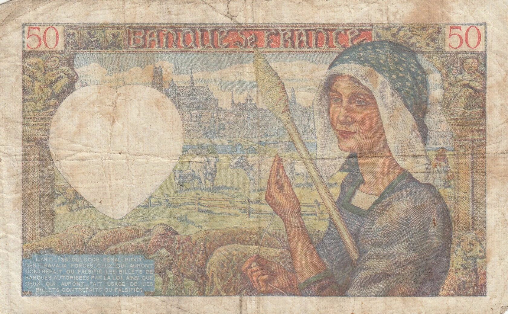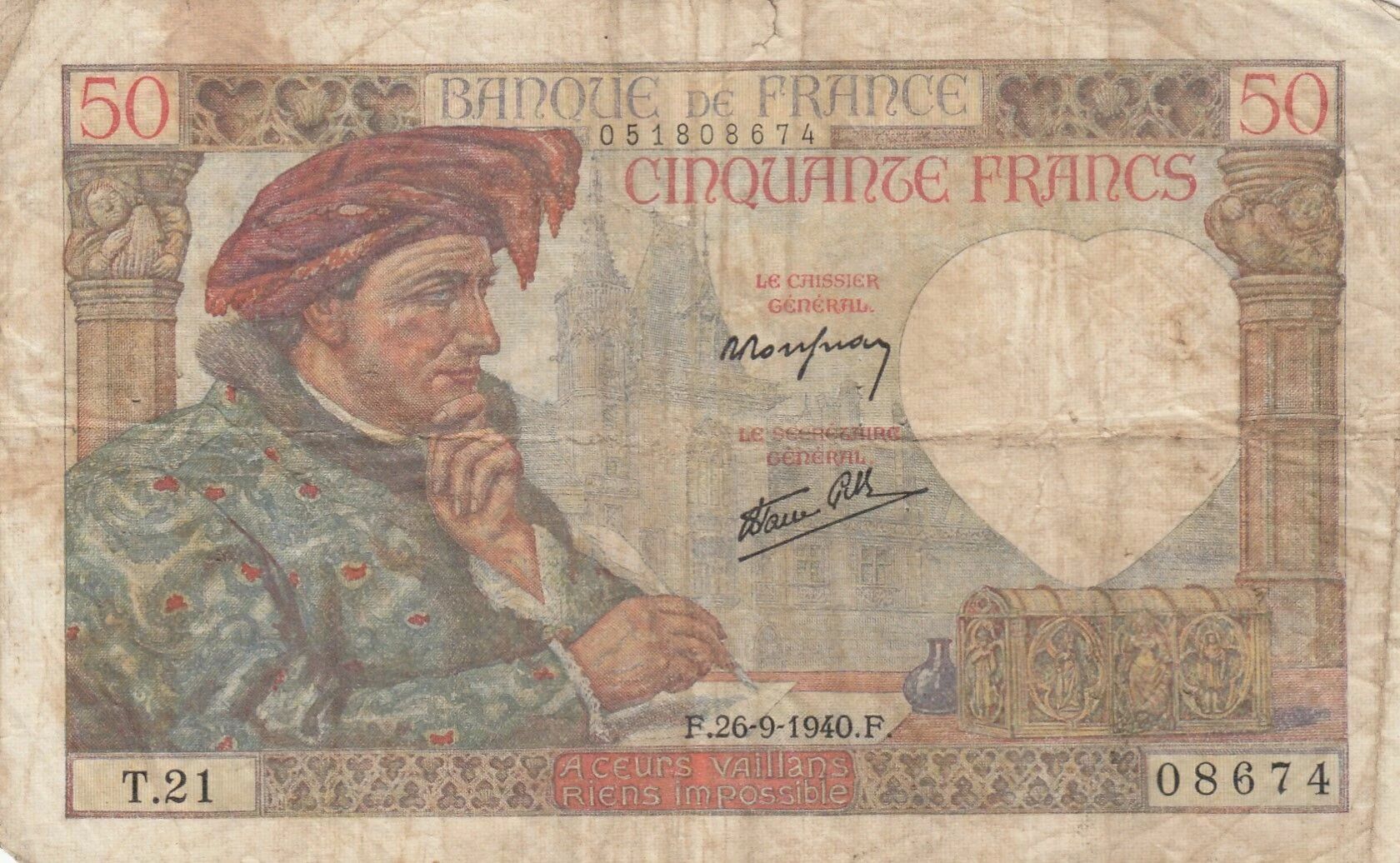 This banknote is an issue of France, with a nominal value of 50 francs. The banknote belongs to the T.21 series and was issued on September 26, 1940.