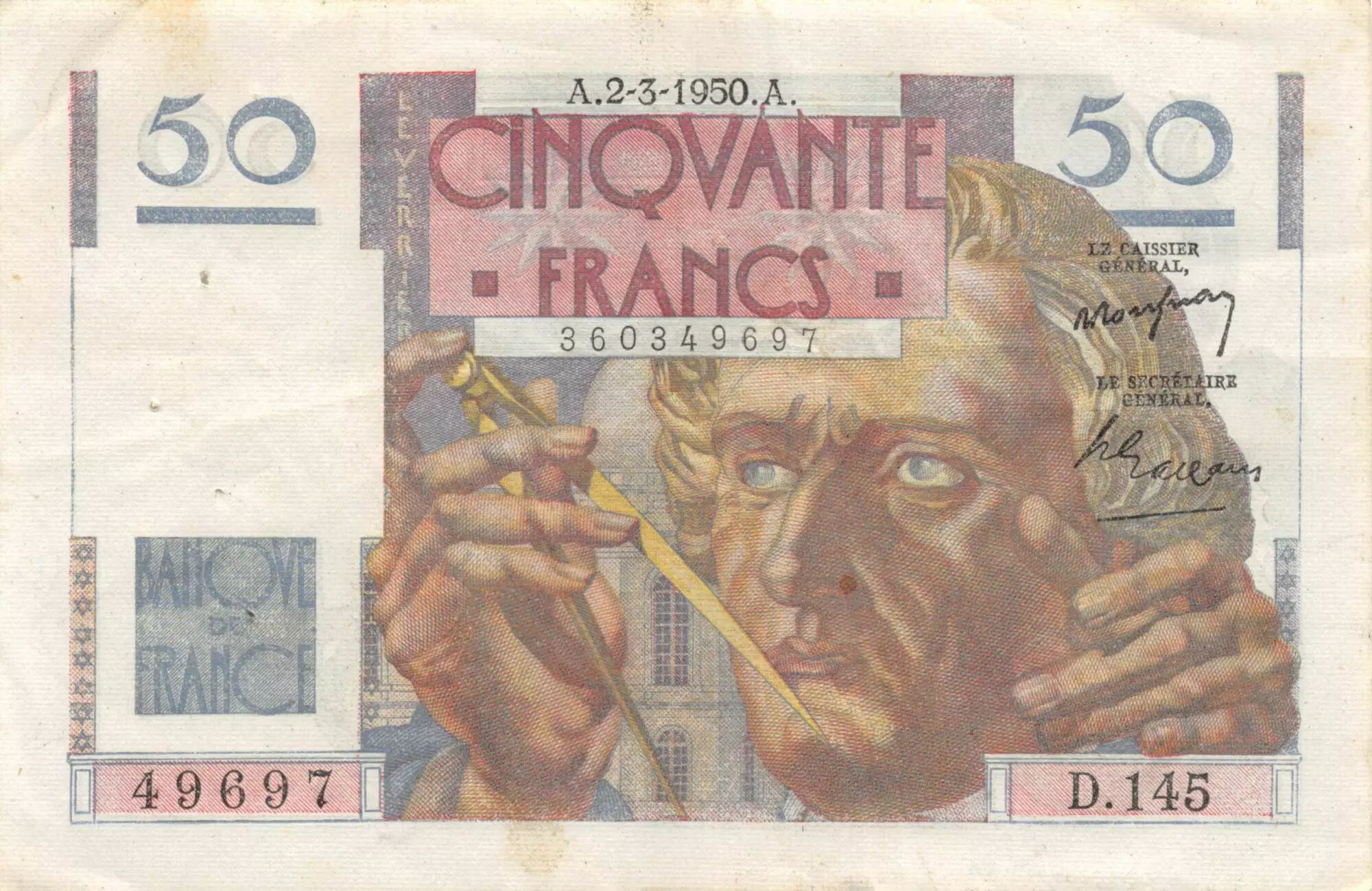 Accueil > Archivage > France 50 Francs - Le Verrier 02-03-1950 - Série D.145 - TTB
