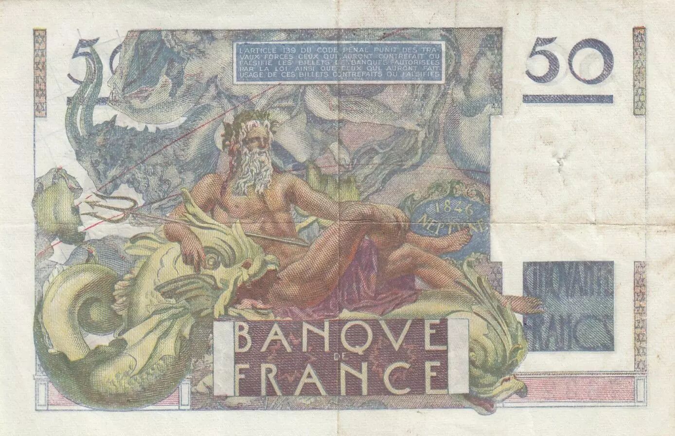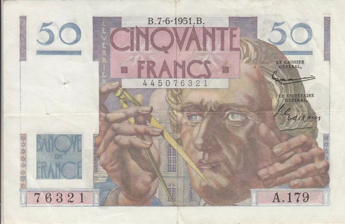 Le recto du billet présente un portrait de Urbain Le Verrier, souvent accompagné d'instruments scientifiques tels qu'un télescope ou des cartes célestes. Des motifs décoratifs et des symboles républicains, tels que la Marianne, peuvent également être présents. La valeur nominale du billet, "50 francs", est clairement indiquée en chiffres et en lettres.