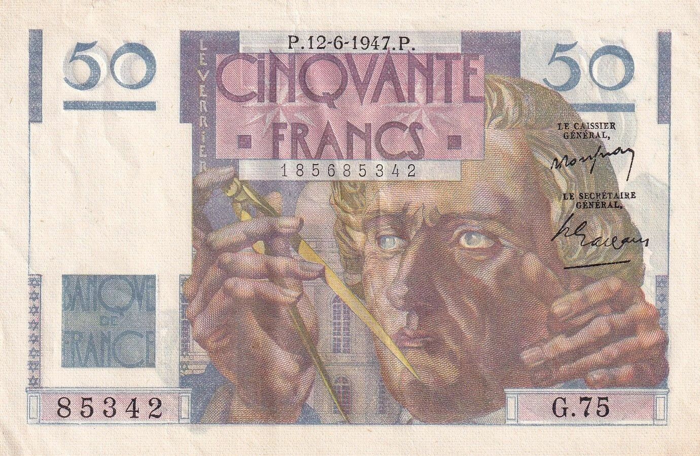 Ce billet de banque français de 50 francs, daté du 12 juin 1947, appartient à la série G.75. Il a été conçu par Robert Poughéon et gravé par André Marliat.