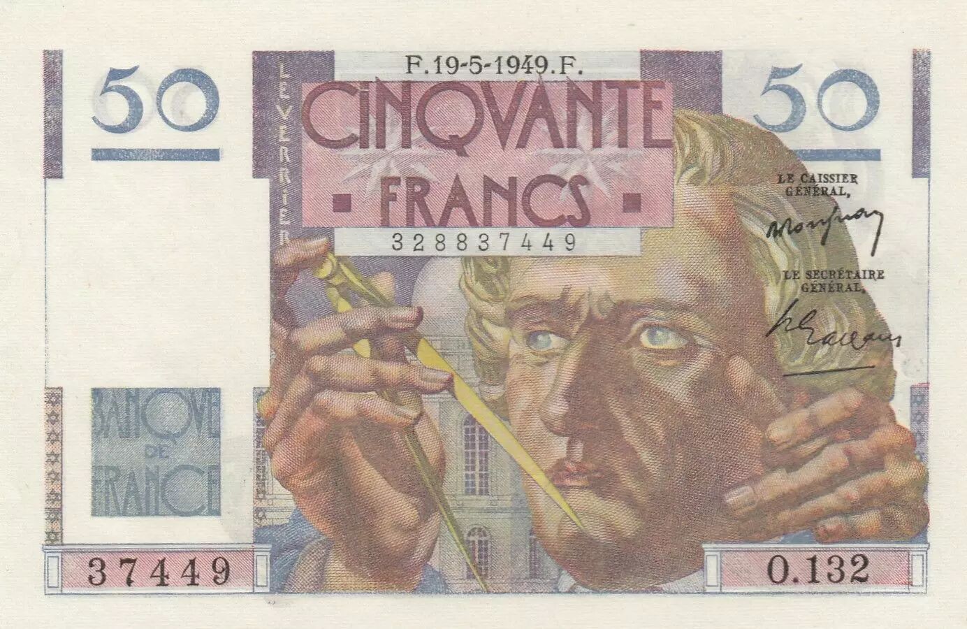 Le billet de 50 francs Le Verrier, émis le 19 mai 1949, est un témoignage de l'histoire monétaire française. Ce billet appartient à la série O.132. Sa valeur nominale est de 50 francs.