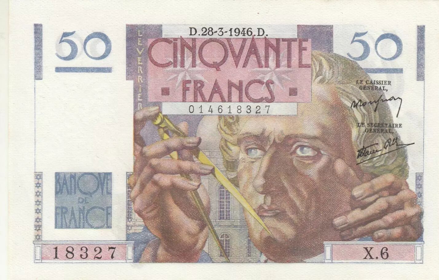 The 50 Francs Le Verrier banknote, dated March 28, 1946, belongs to the X.6 series and was issued in France. This banknote represents a nominal value of 50 francs, a monetary unit used in France at that time.