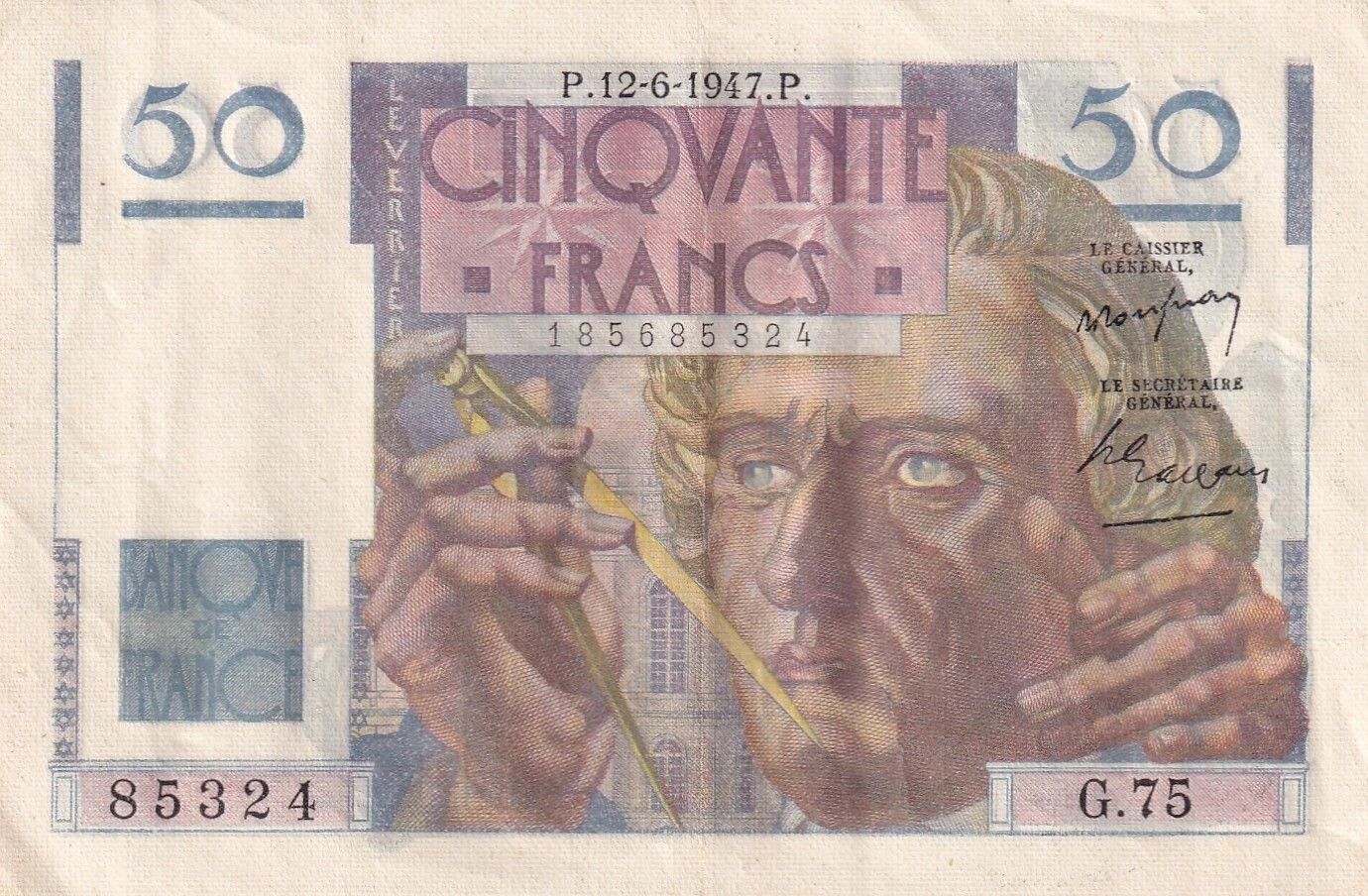 The front of the note features a portrait of Urbain Le Verrier, depicted holding a compass. The background of this portrait is adorned with a representation of the Paris Observatory. The inscriptions on this side of the note include the face value "50" repeated twice, as well as the words "CINQUANTE FRANCS" and "BANQUE DE FRANCE". The writing used is Latin.
