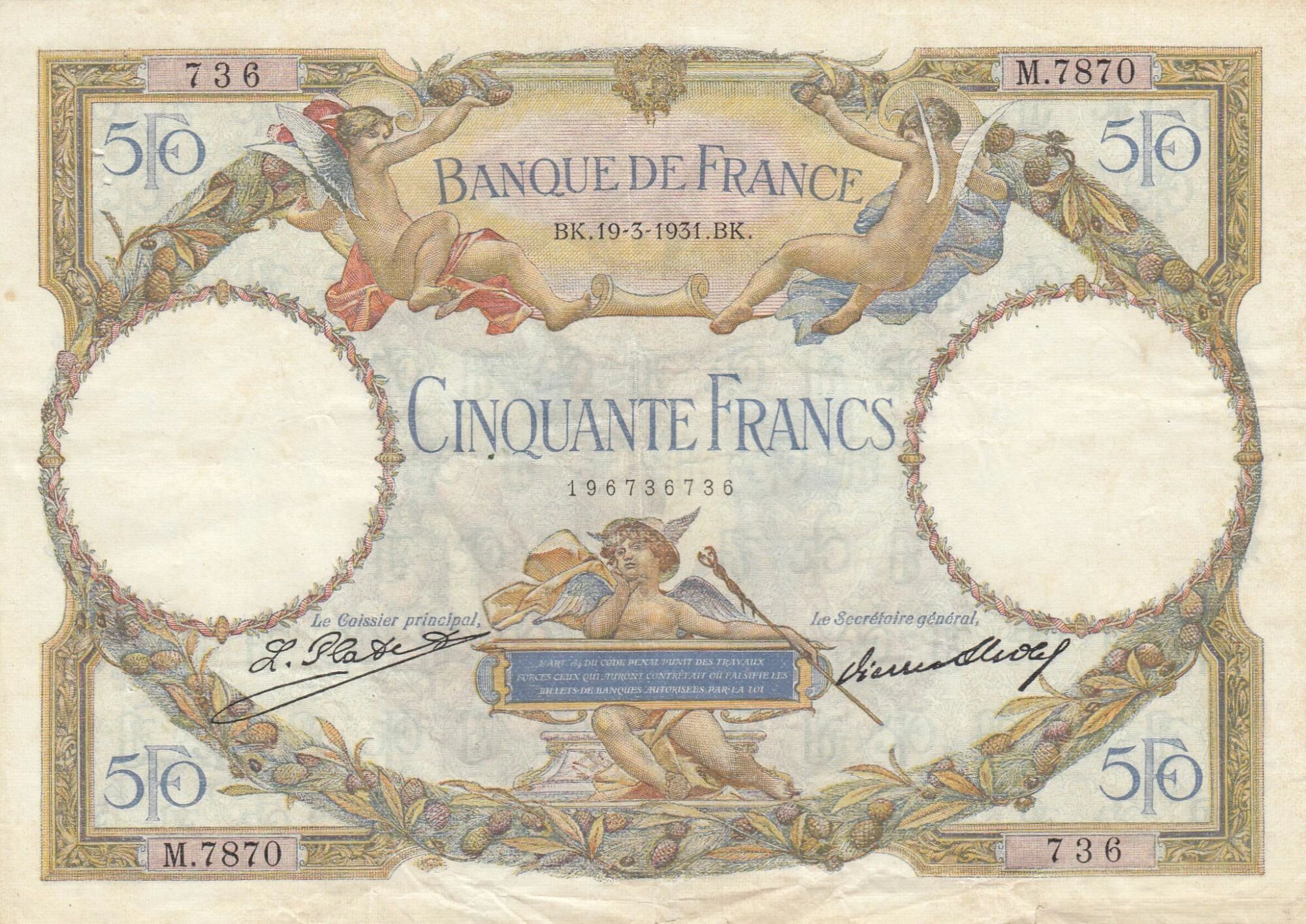 This French banknote has a face value of 50 francs. It was issued in 1931.