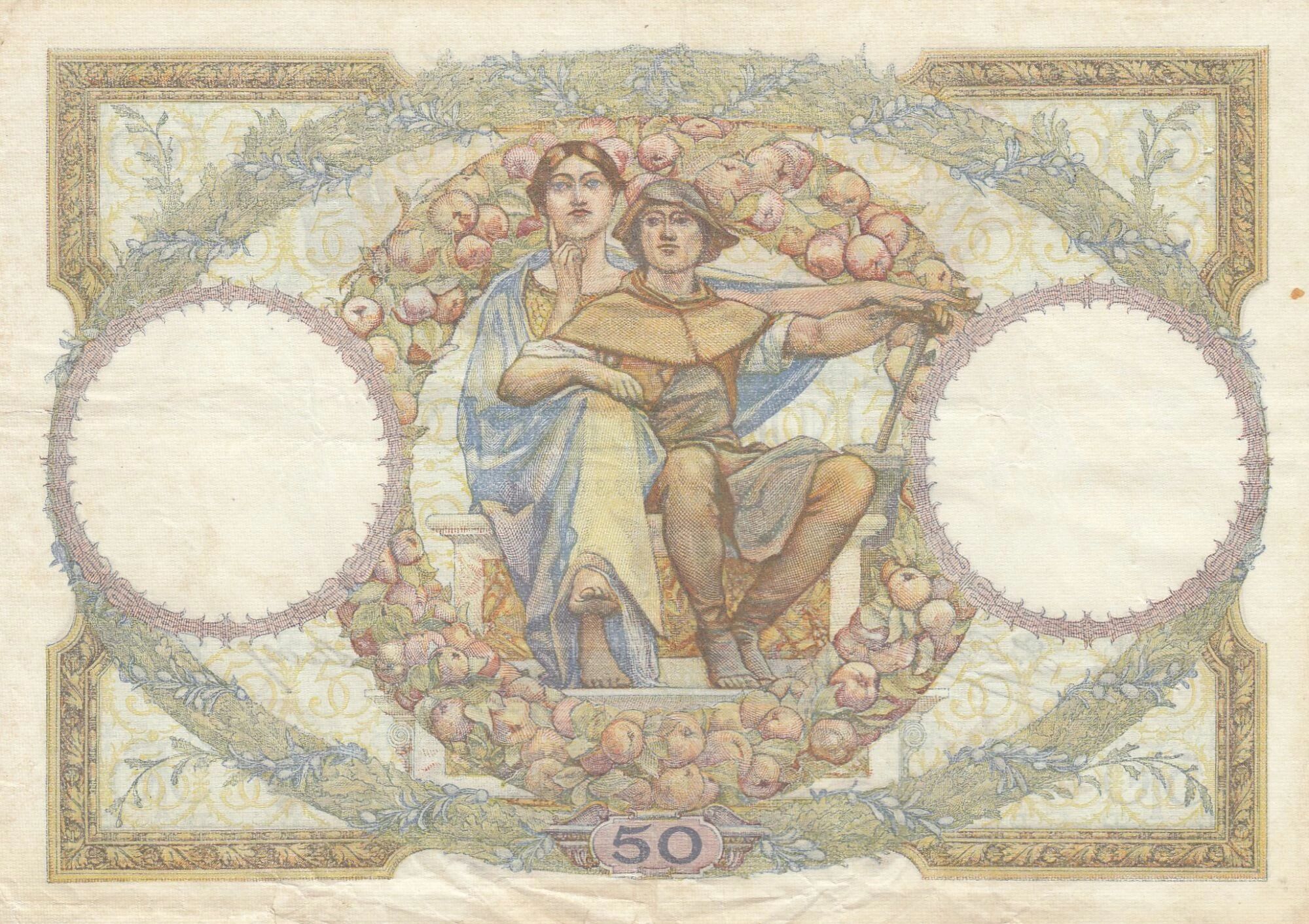 On the obverse, there is a scene depicting allegorical figures, potentially related to agriculture, commerce or industry, reflecting the economic values ??of France of that period. The face value, "50 Francs", is clearly indicated, as well as the mention "Banque de France". The signature of the issuing officials is also present.