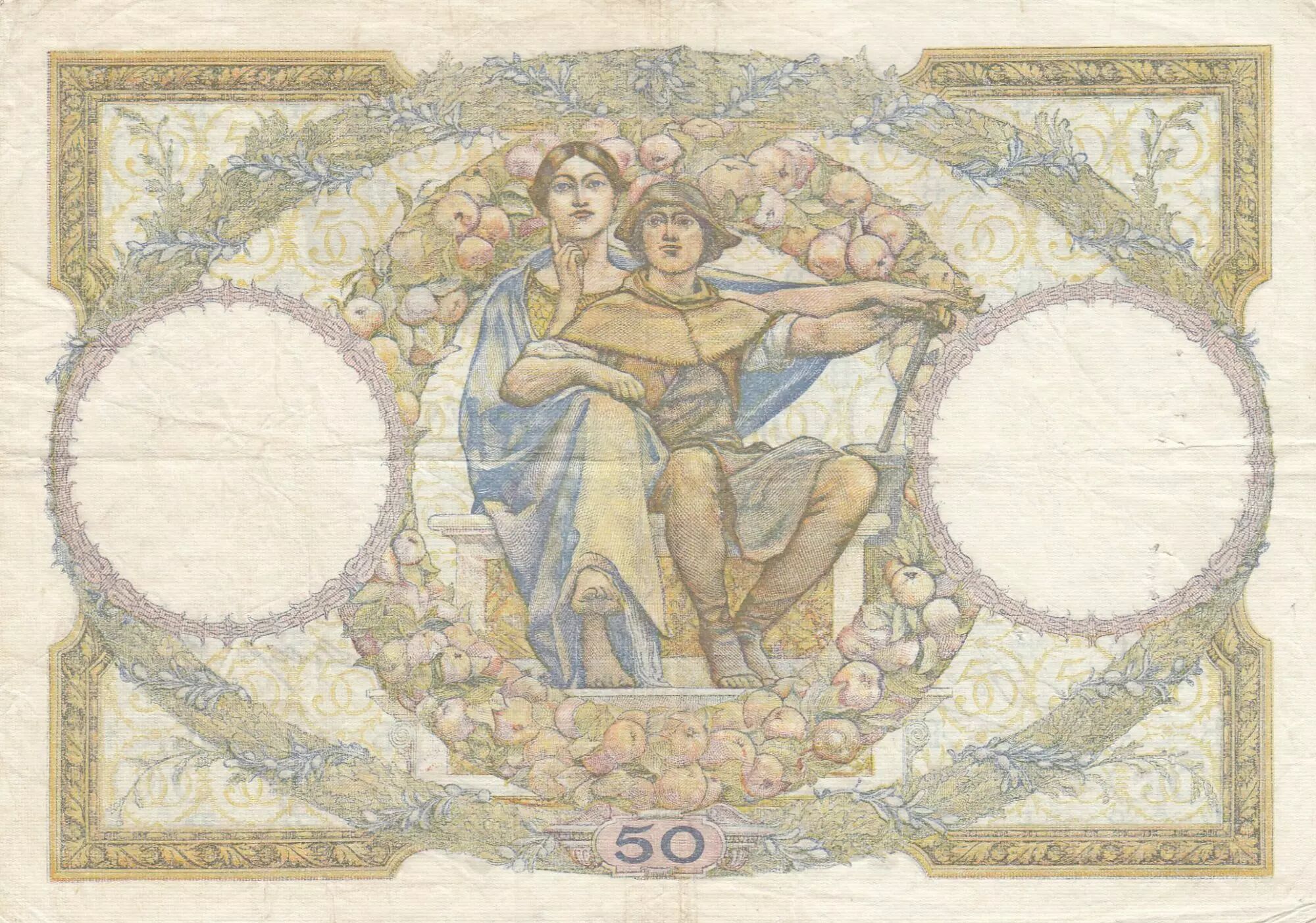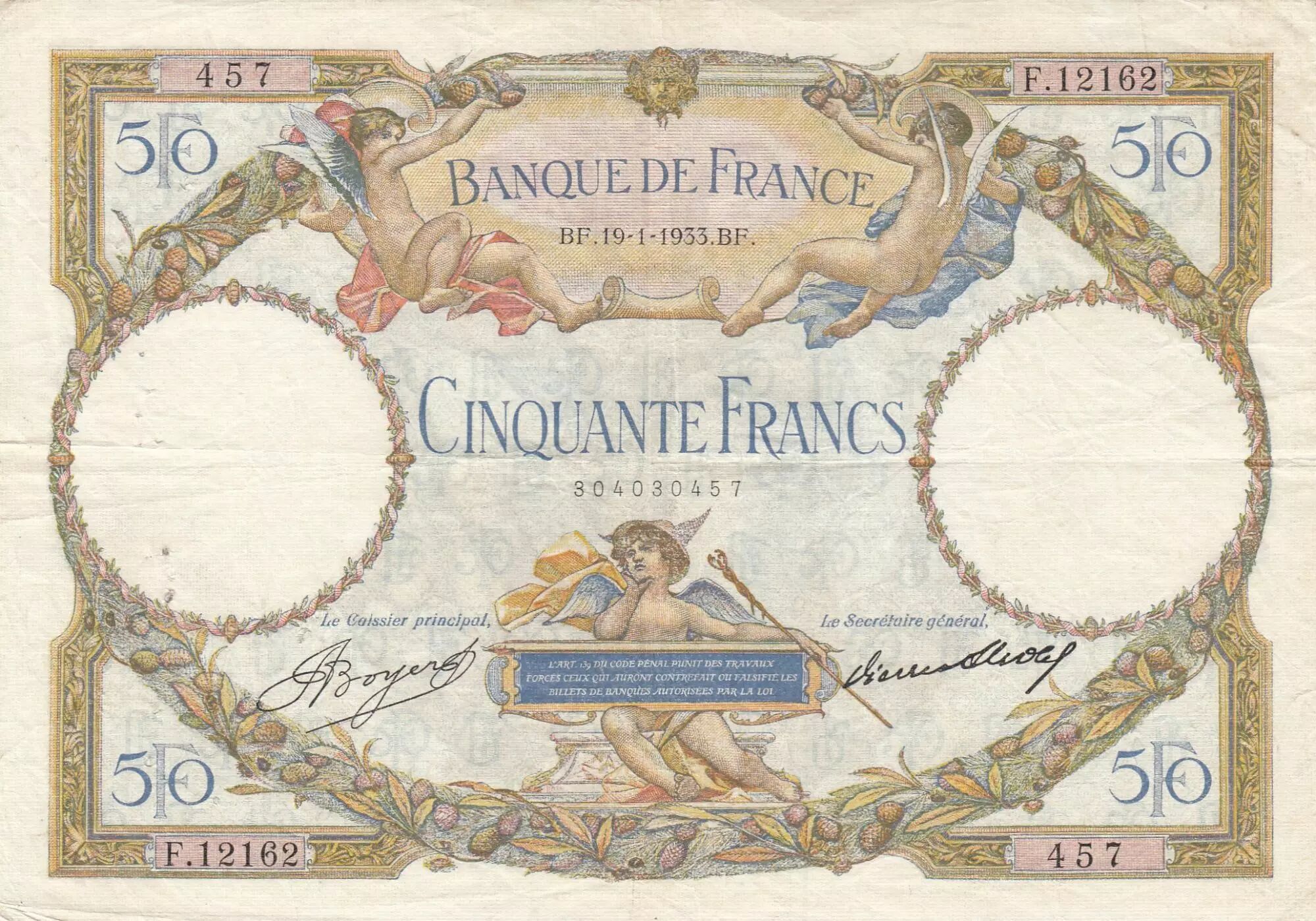 This French banknote has a face value of 50 francs. It was issued in 1933.