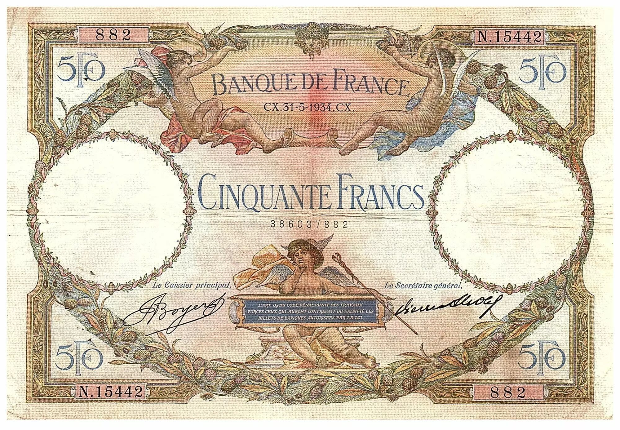 Accueil > Billets Français > Billets Banque de France > Billets 50 Francs > Luc Oliver Merson type 1927 (1927-1934) > France 50 Francs - Luc Olivier Merson - 31-05-1934 - Série N.15442 - F.16.05