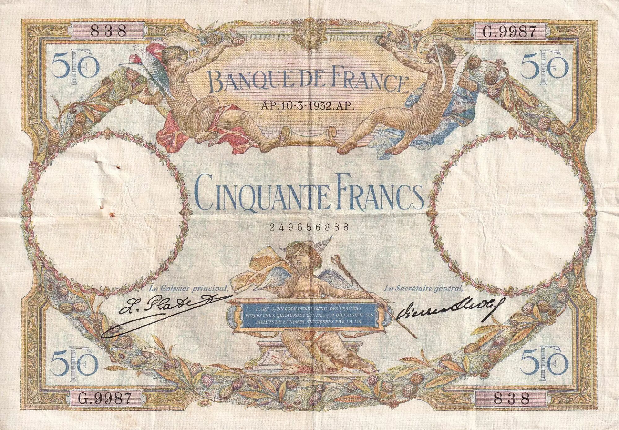 Accueil > Archivage > France 50 Francs Luc Olivier Merson modifié - 10-03-1932 - Série G.9987 - Fay.16.03
