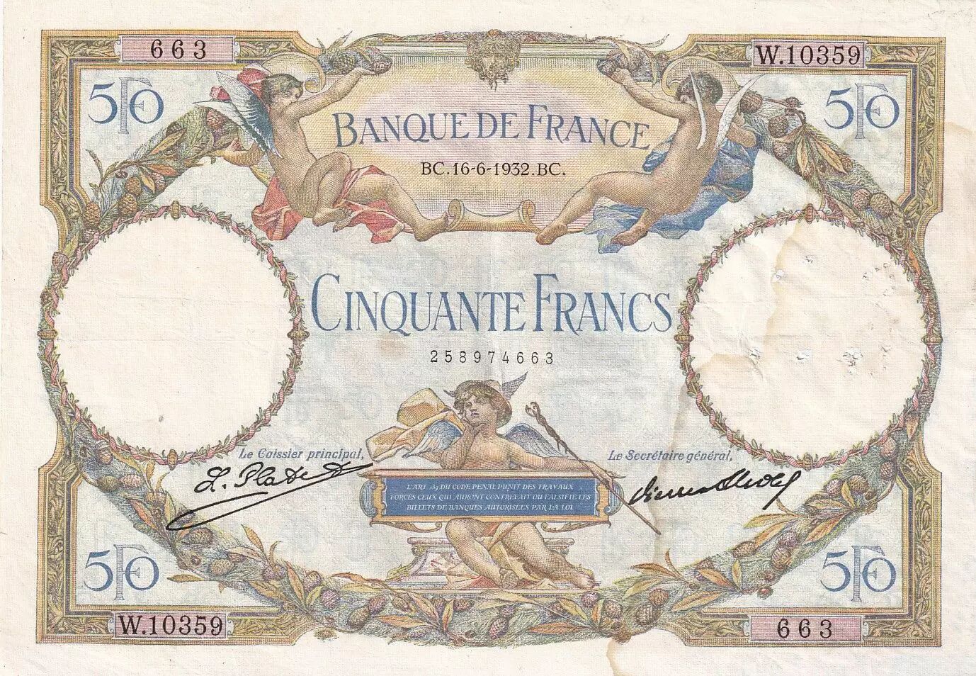 Billet France 50 Francs Luc Olivier Merson modifié - 16-06-1932 - Série W.10359