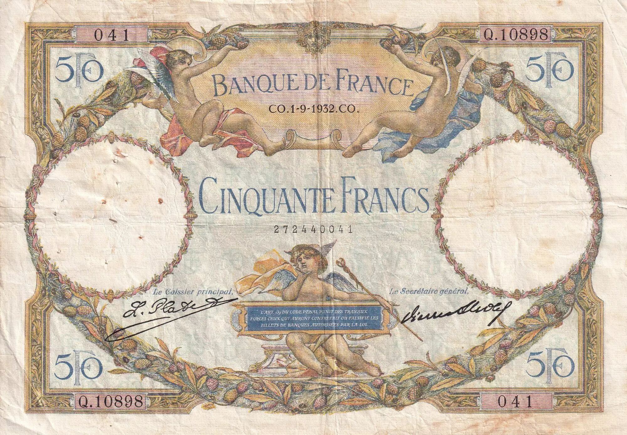 Banknote France 50 Francs Luc Olivier Merson modified - 01-09-1932 - Serial Q.10898 - Fay.16.03