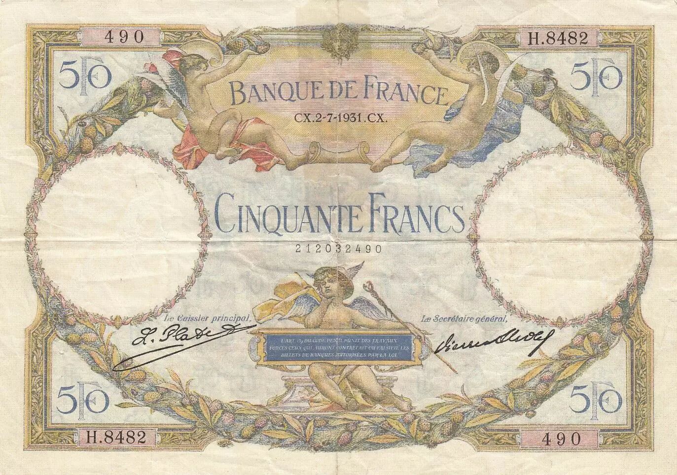 Banknote France 50 Francs Luc Olivier Merson modified - 02-07-1931 - Serial H.8482