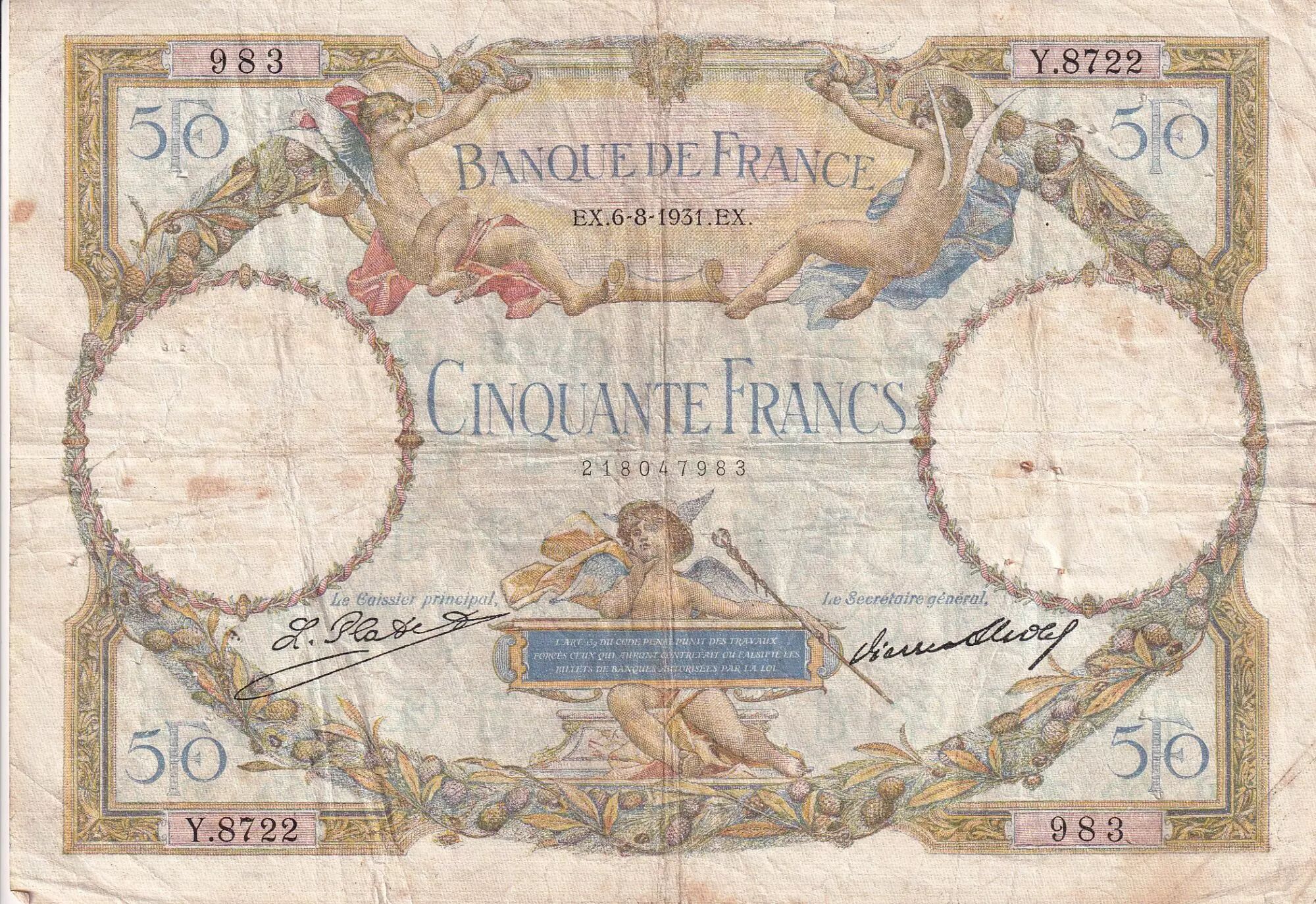 Banknote France 50 Francs Luc Olivier Merson modified - 06-08-1931- Serial Y.8722 - Fay.16.02