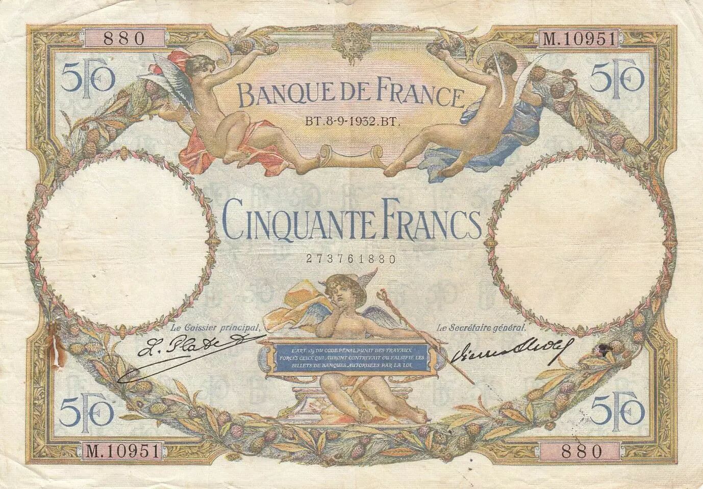 Banknote France 50 Francs Luc Olivier Merson modified - 08-09-1932 - Serial M.10951