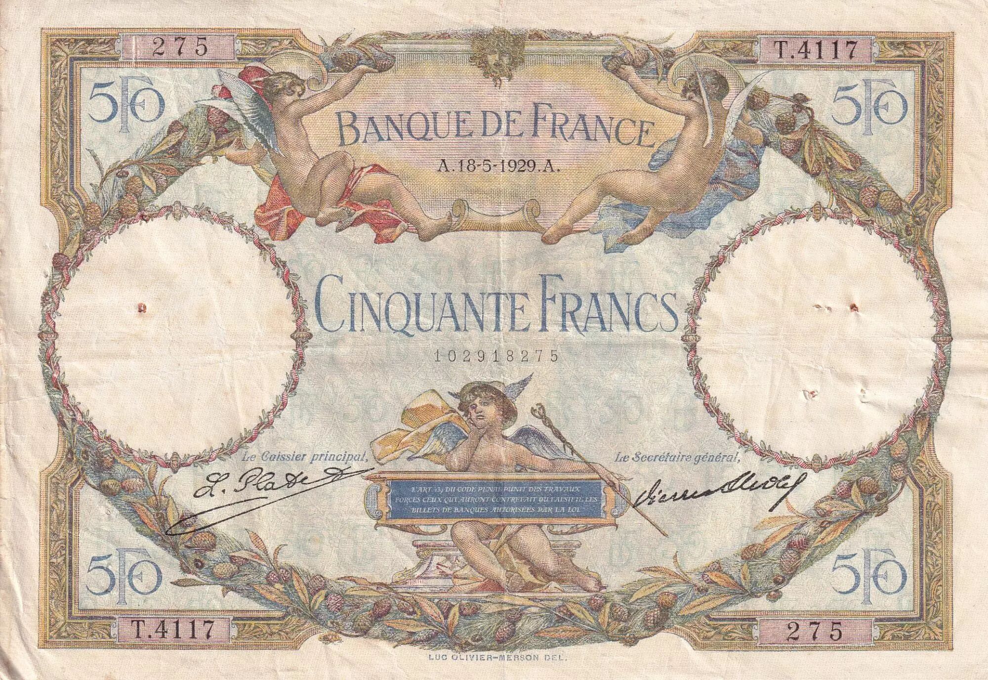 Home > French Banknotes > Bank of France Banknotes > 50 Francs Banknotes > Luc Oliver Merson Type 1927 (1927-1934) > France 50 Francs Luc Olivier Merson modified - 18-05-1929 - Serial T.4117 - Fay.15.03