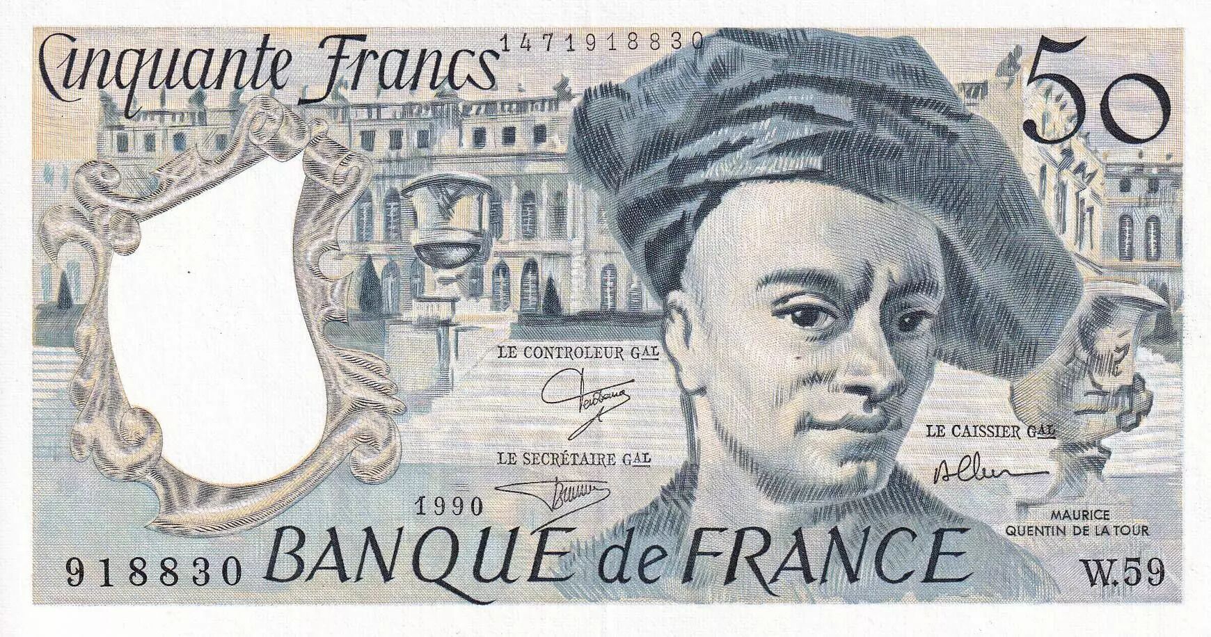 Home > French Banknotes > Bank of France Banknotes > 50 Francs Banknotes > Quentin de la Tour Type 1976 (1976-1992) > France 50 Francs - Quentin de la Tour - 1990 - Serial W.59 - PUNC - P.152e