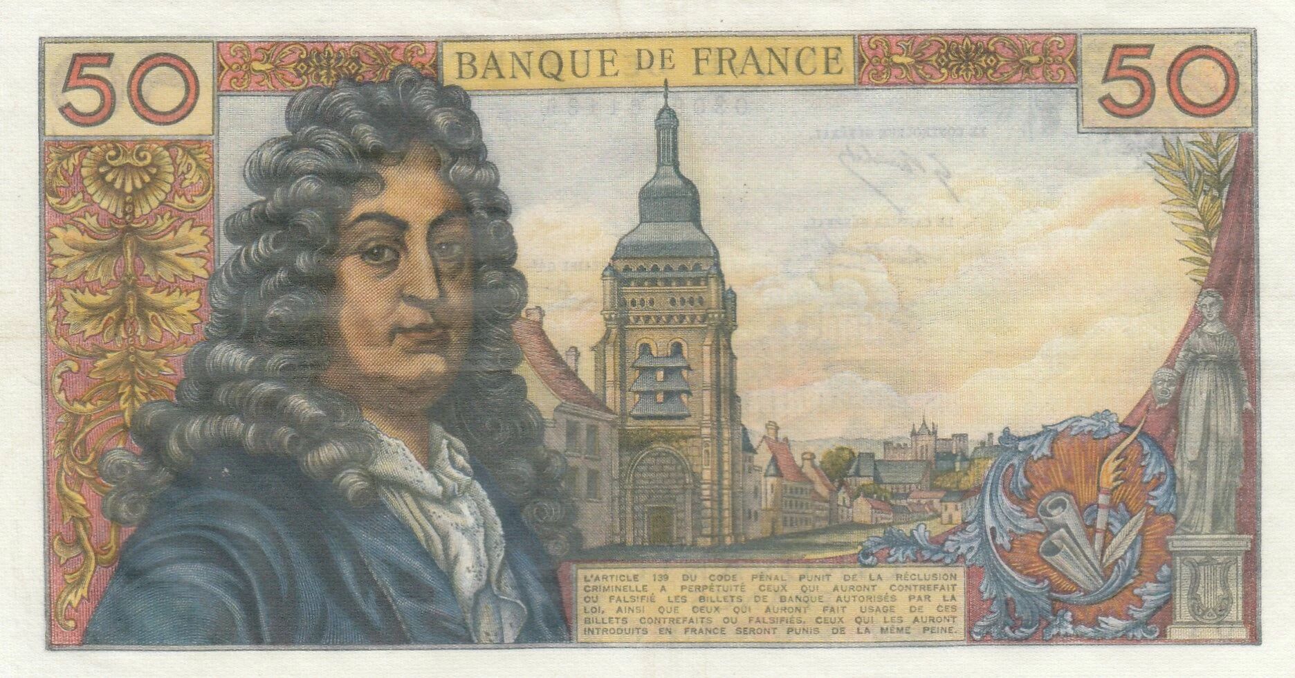 Le recto du billet présente un portrait de Jean Racine, dramaturge et poète français du XVIIe siècle. Il est représenté en costume d'époque, avec une perruque et un jabot. À l'arrière-plan, on aperçoit une scène de théâtre évoquant ses ?uvres classiques. La mention "Banque de France" figure en haut du billet, et la valeur nominale "50 Francs" est indiquée en toutes lettres et en chiffres. La signature duCaissier général et celle du Secrétaire général sont également présentes.