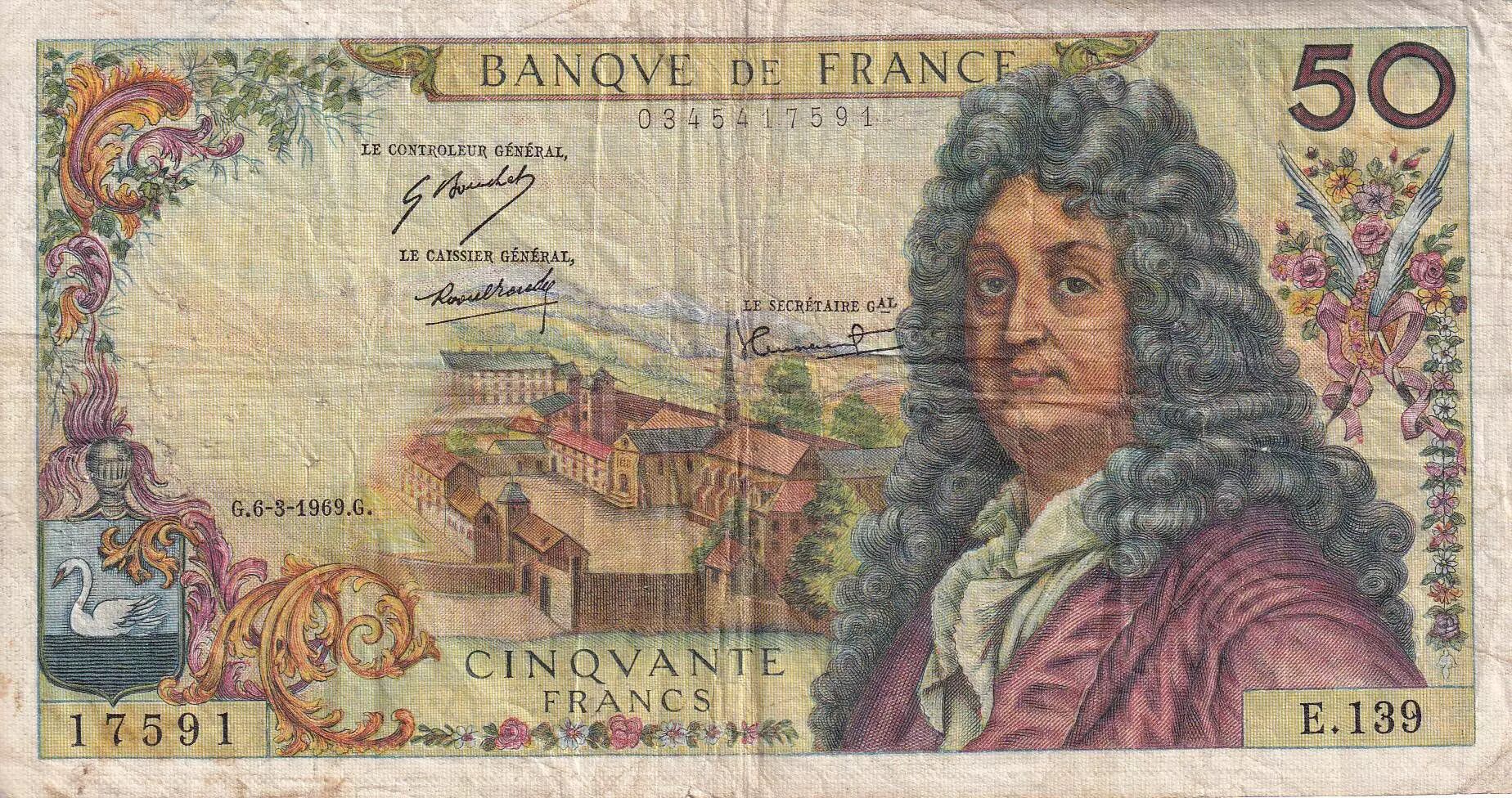 Home > > France 50 Francs - Racine - 06-03-1969 - Serial E.139 - F - P.148c