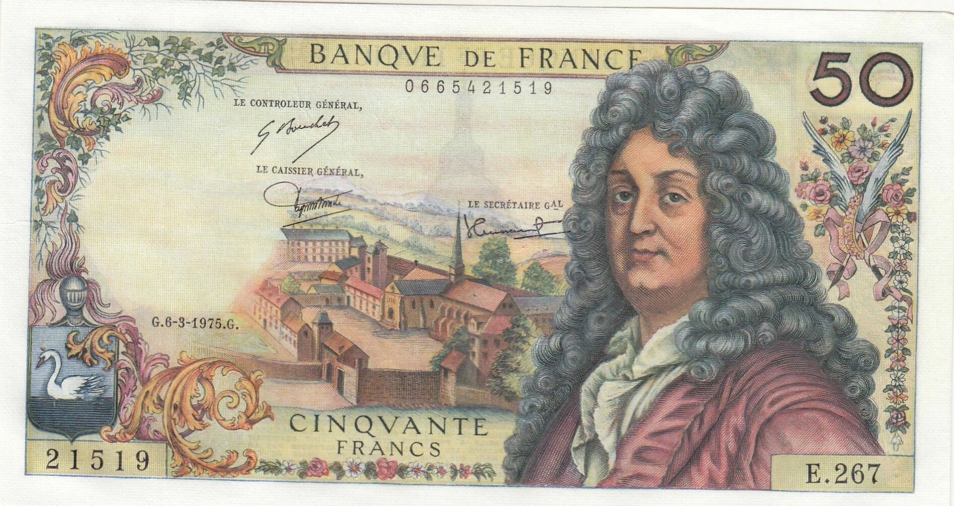 Le billet de 50 Francs Racine, daté du 06-03-1975 et appartenant à la série E.267, est un billet de banque émis en France.