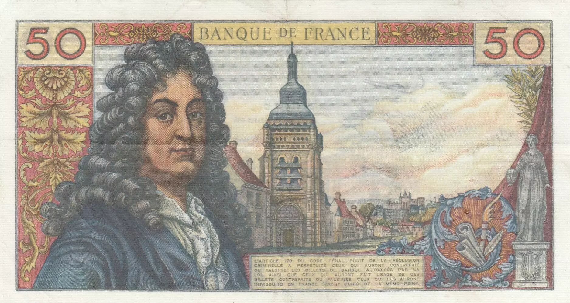 The banknote is printed in polychrome, combining several colors to create a complex and detailed image. The front of the banknote features a portrait of Jean Racine, a 17th-century French playwright and poet. Racine's image is accompanied by ornamental motifs and allegorical symbols typical of banknotes of that era.