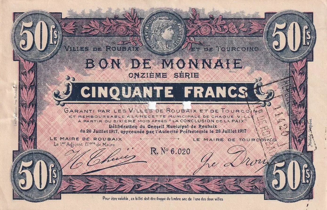 Ce billet de nécessité, d'une valeur faciale de 50 francs, a été émis par les villes de Roubaix et Tourcoing, situées dans le département du Nord, en France.